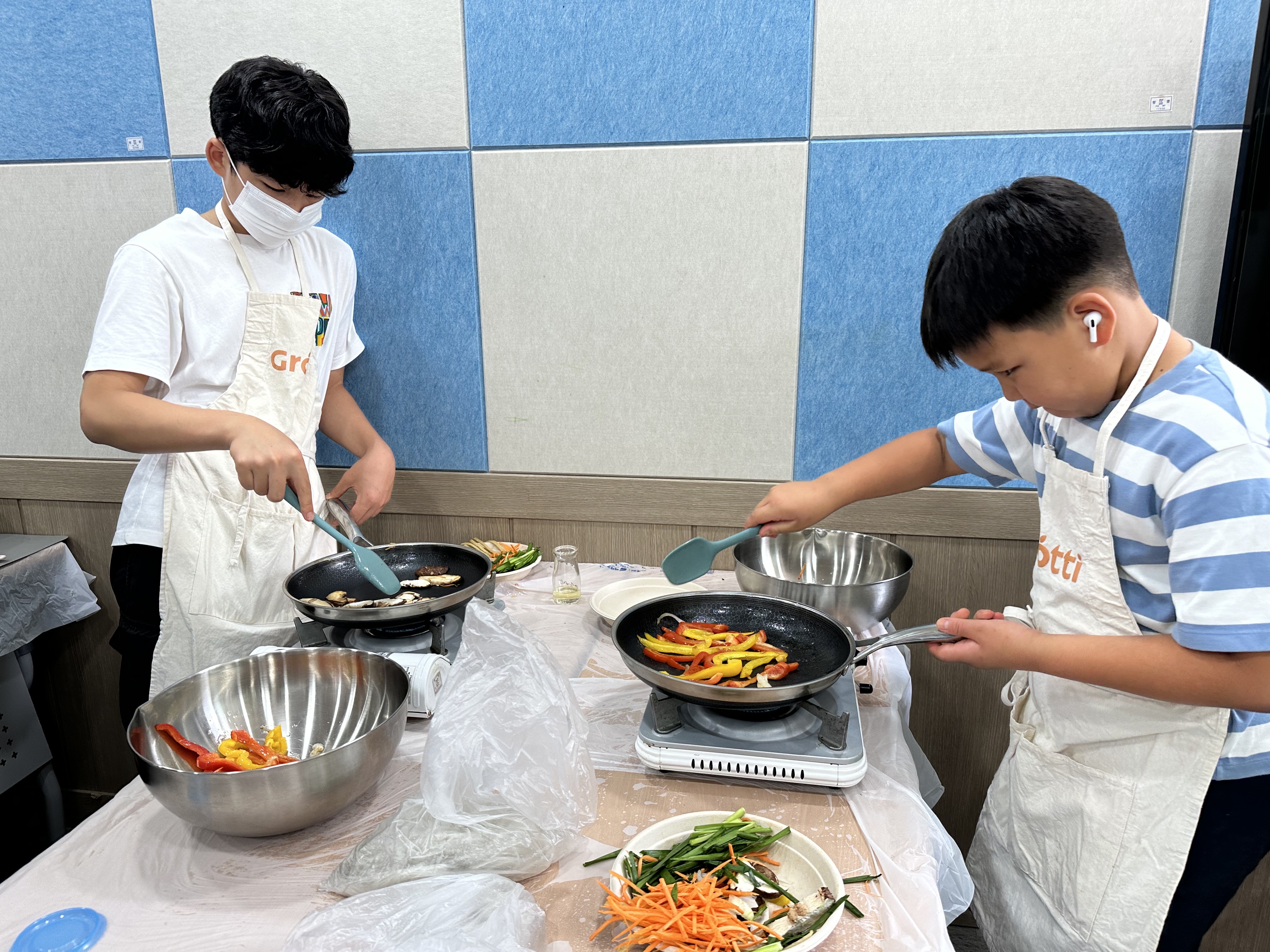 익숙하게 재료를 손질하는 형, 누나들을 보며 동생들도 열심히 야채를 손질하고 요리에 집중하는 모습이 제법 요리사 같은 모습이더군요.