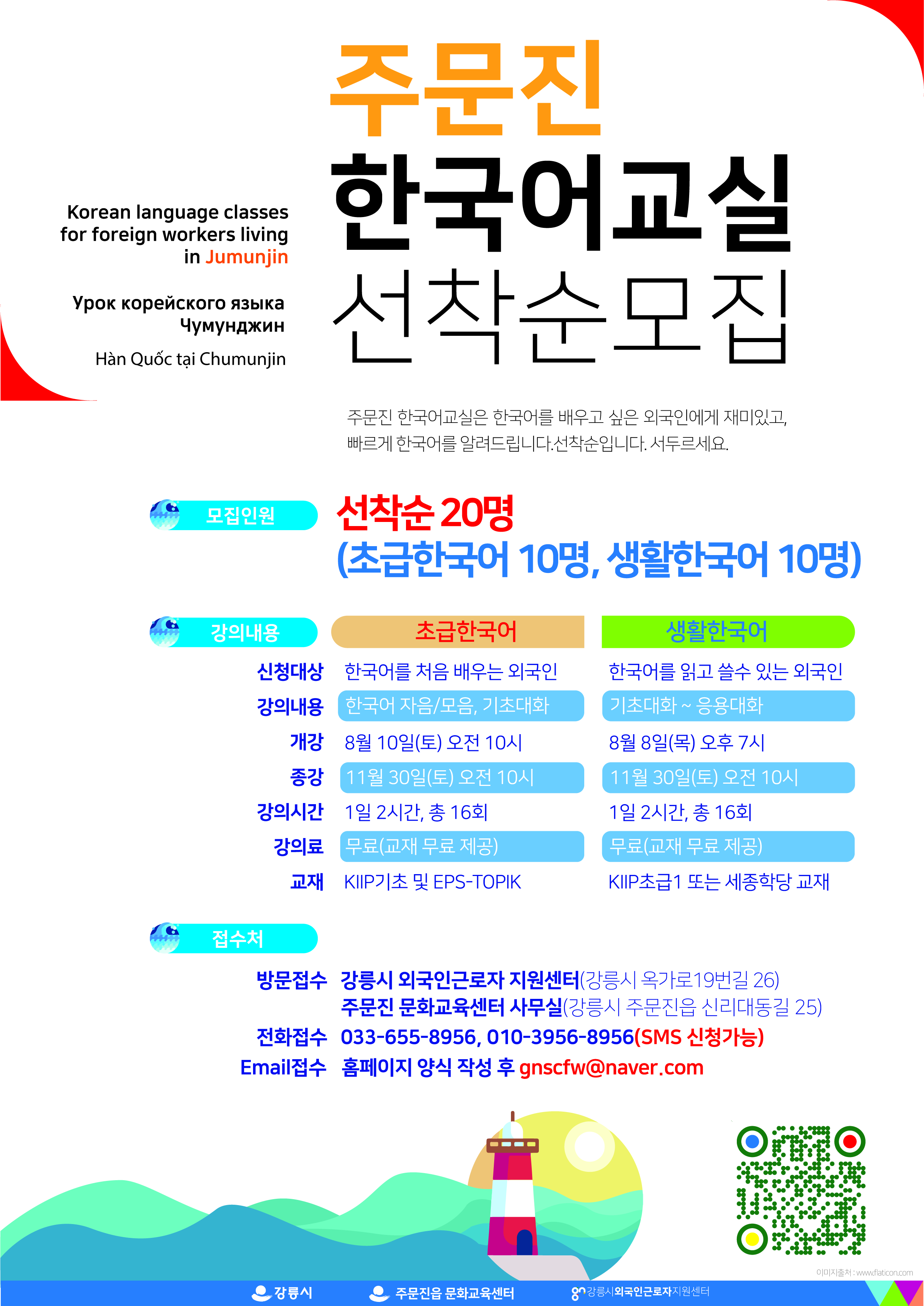 주문진 한국어교실에 참여할 외국인근로자를 모집합니다.