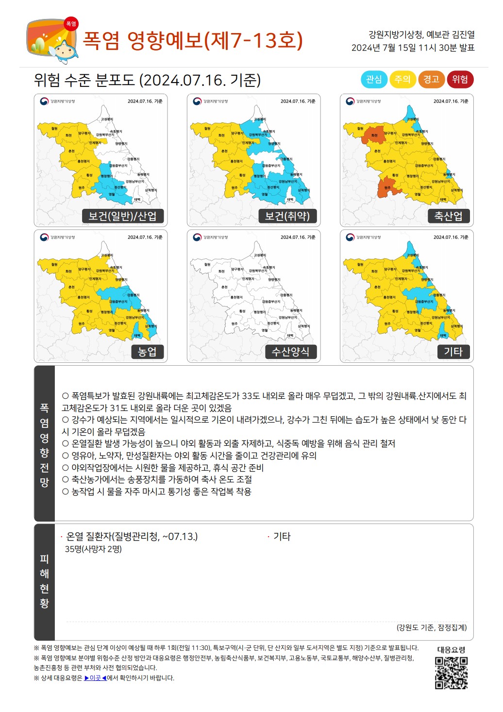 [강원지방기상청] 폭염영향예보(2024.7.7.~2024.7.13.) (0) | 2024.07.07 |