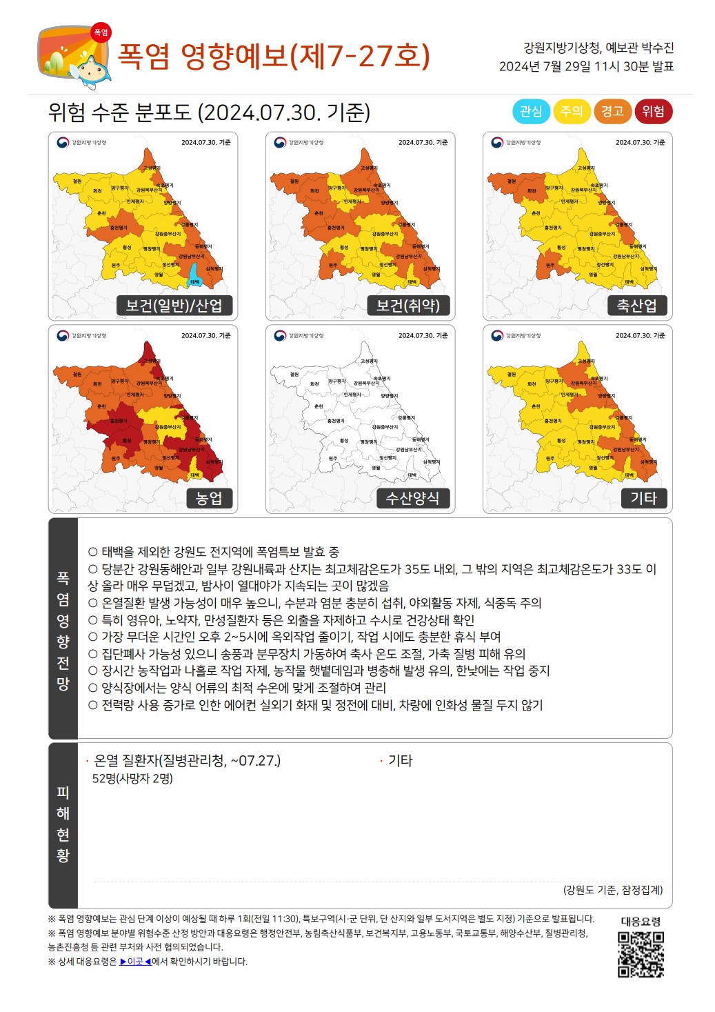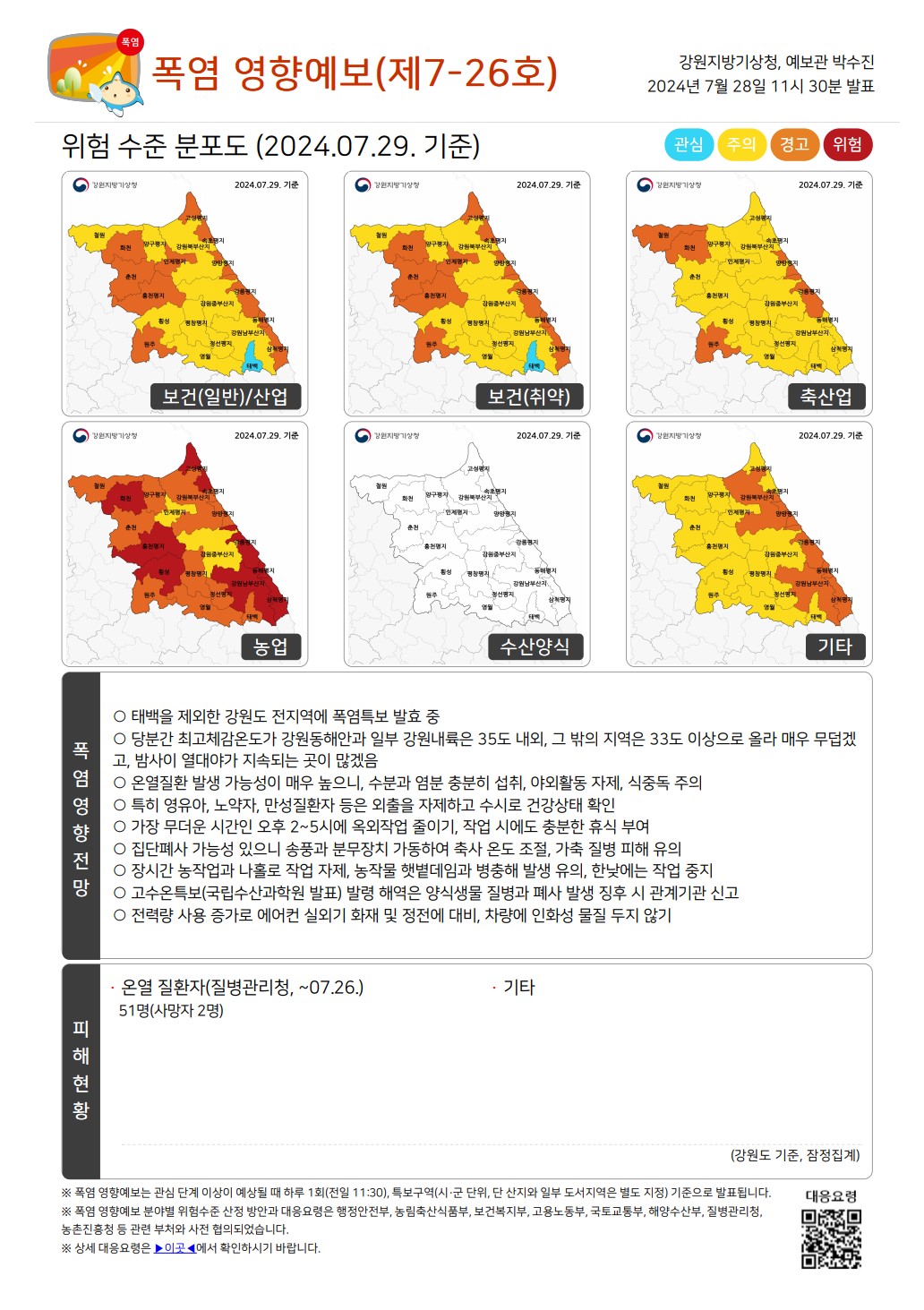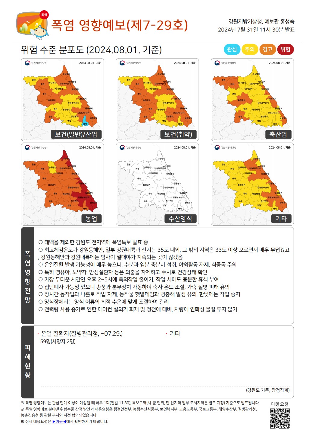 강원강원지방기상청에서 전하는 2024년 7월 29일부터 8월 4일까지 폭염영향예보입니다.