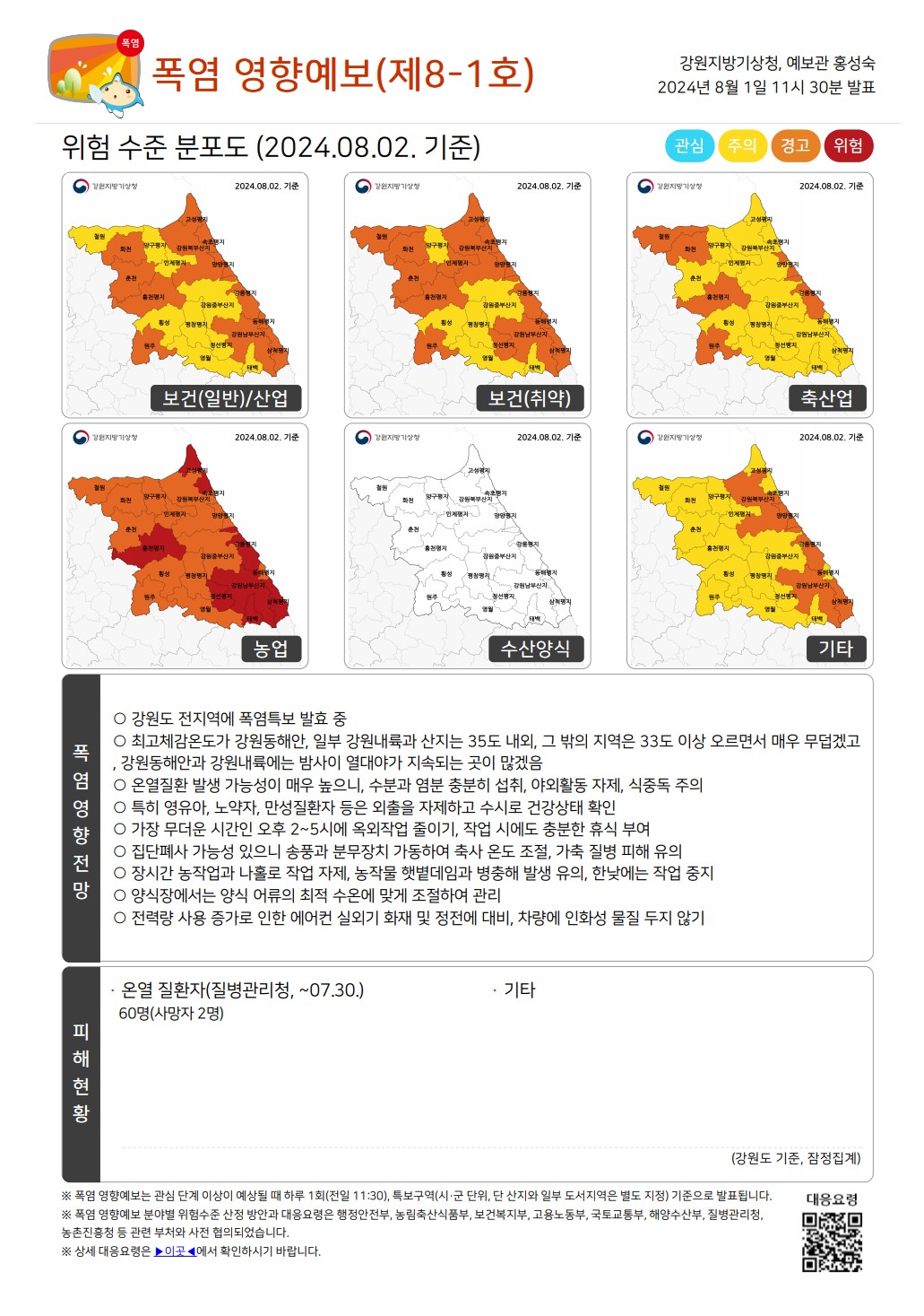 | [강원지방기상청] 폭염 영향예보(2024.8.11.~2024.8.17.) (1) | 2024.08.12 |