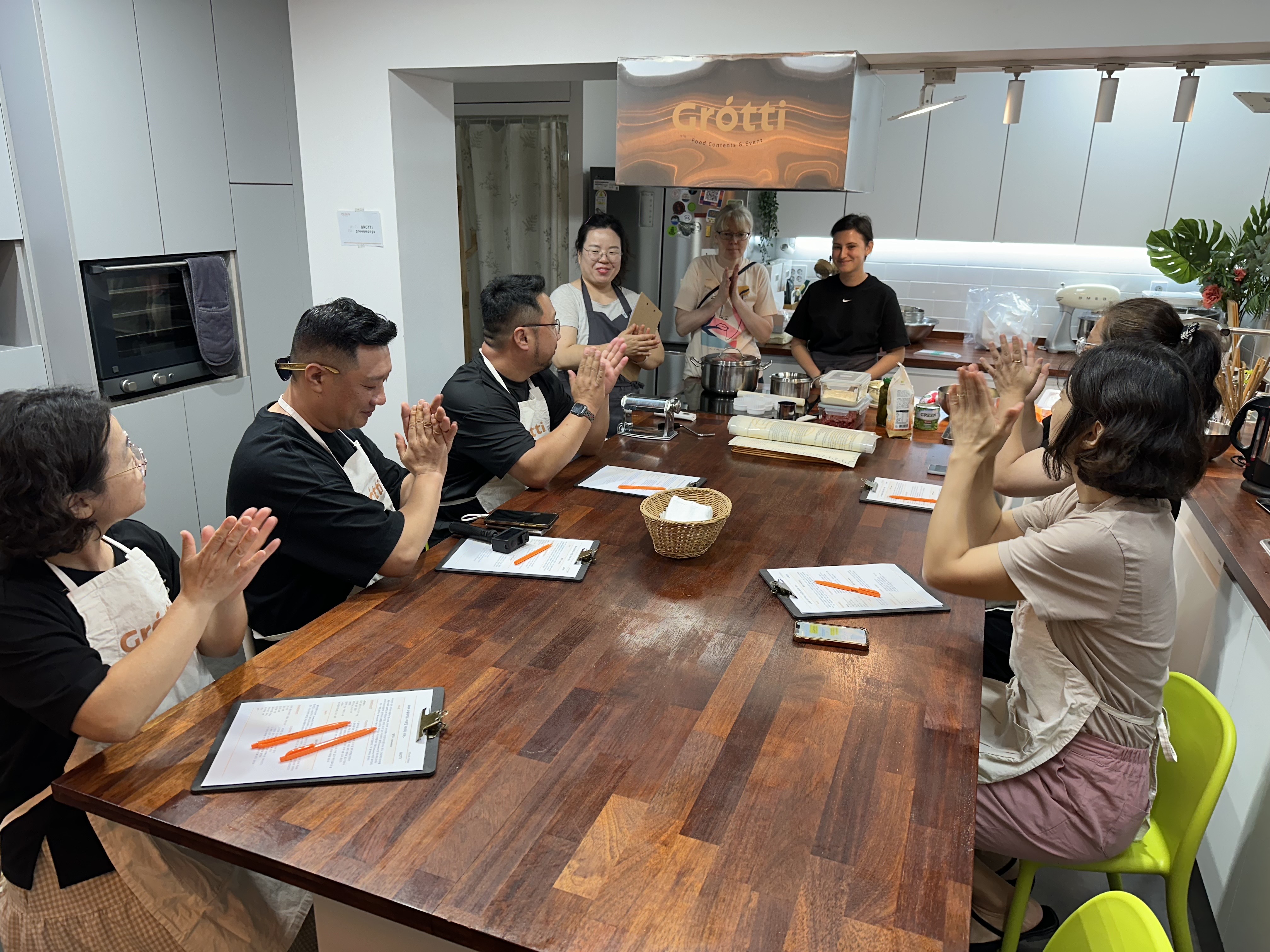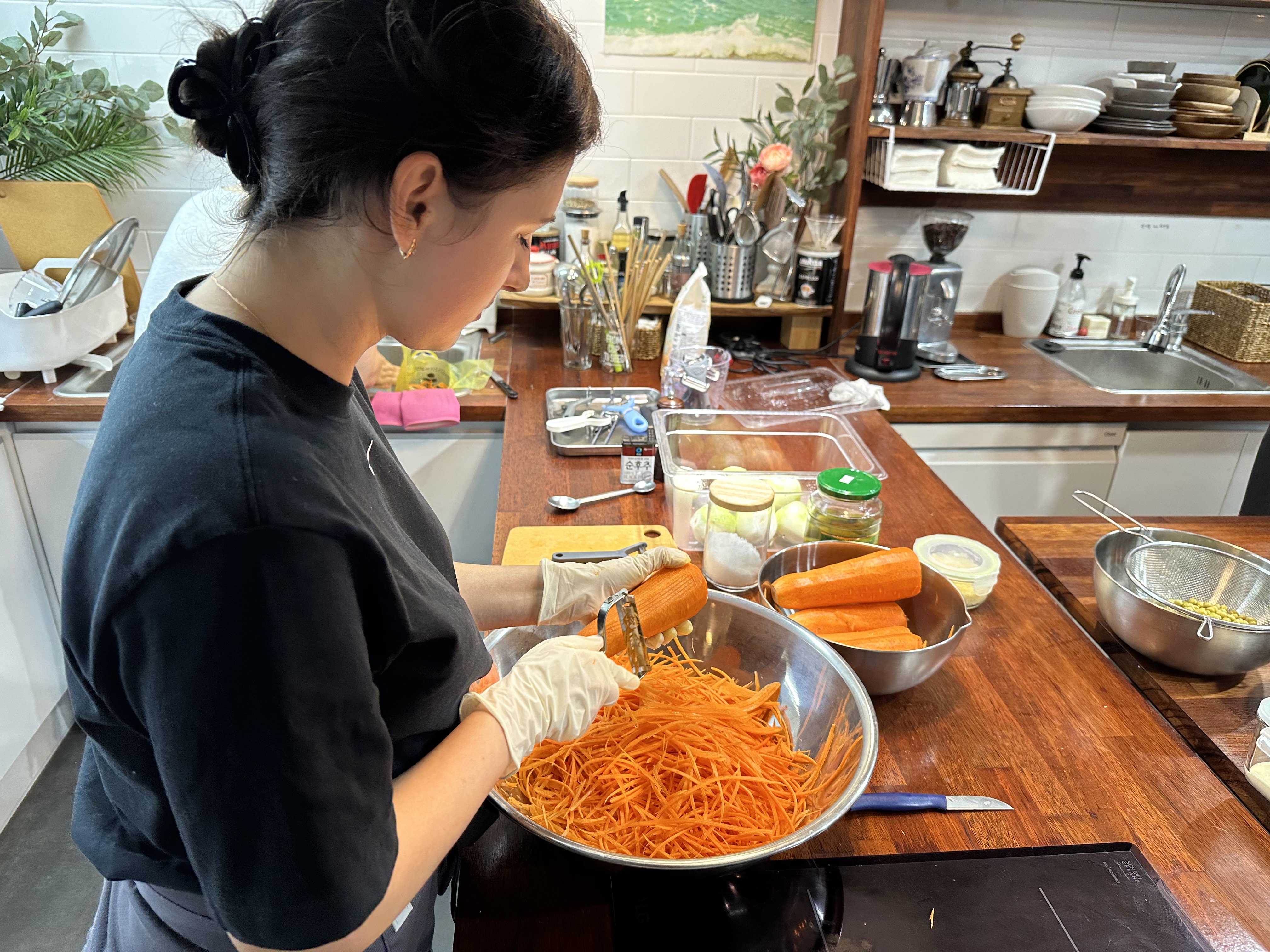 프랩을 해야 할 것 있어서, 그로티 대표가 사전에 준비해 놓은 삶은 채소와 과일, 당근을 수강생에게 나눠주기 위해 밑작업을 했습니다. 요리사와 통역사는 처음 뵙는 사이도 아닌데....즐거운 이야기를 나누는지 계속 말씀을 나누시네요~~