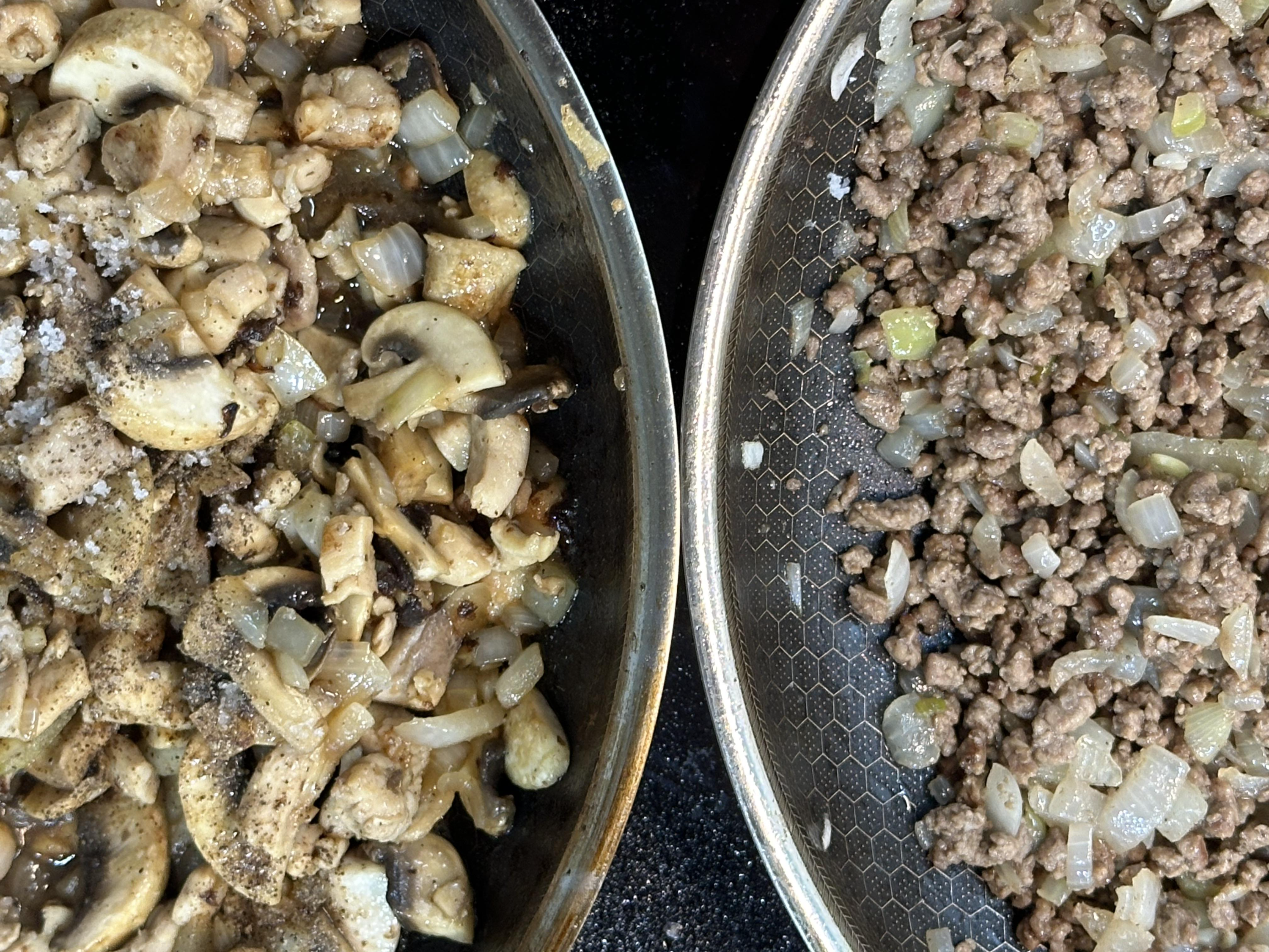 블리니 전병을 만들고 닭고기와 소고기를 다음어 양파와 버섯을 넣고, 소금간과 후추로 간을 해 삼삼한 소을 만들었습니다.