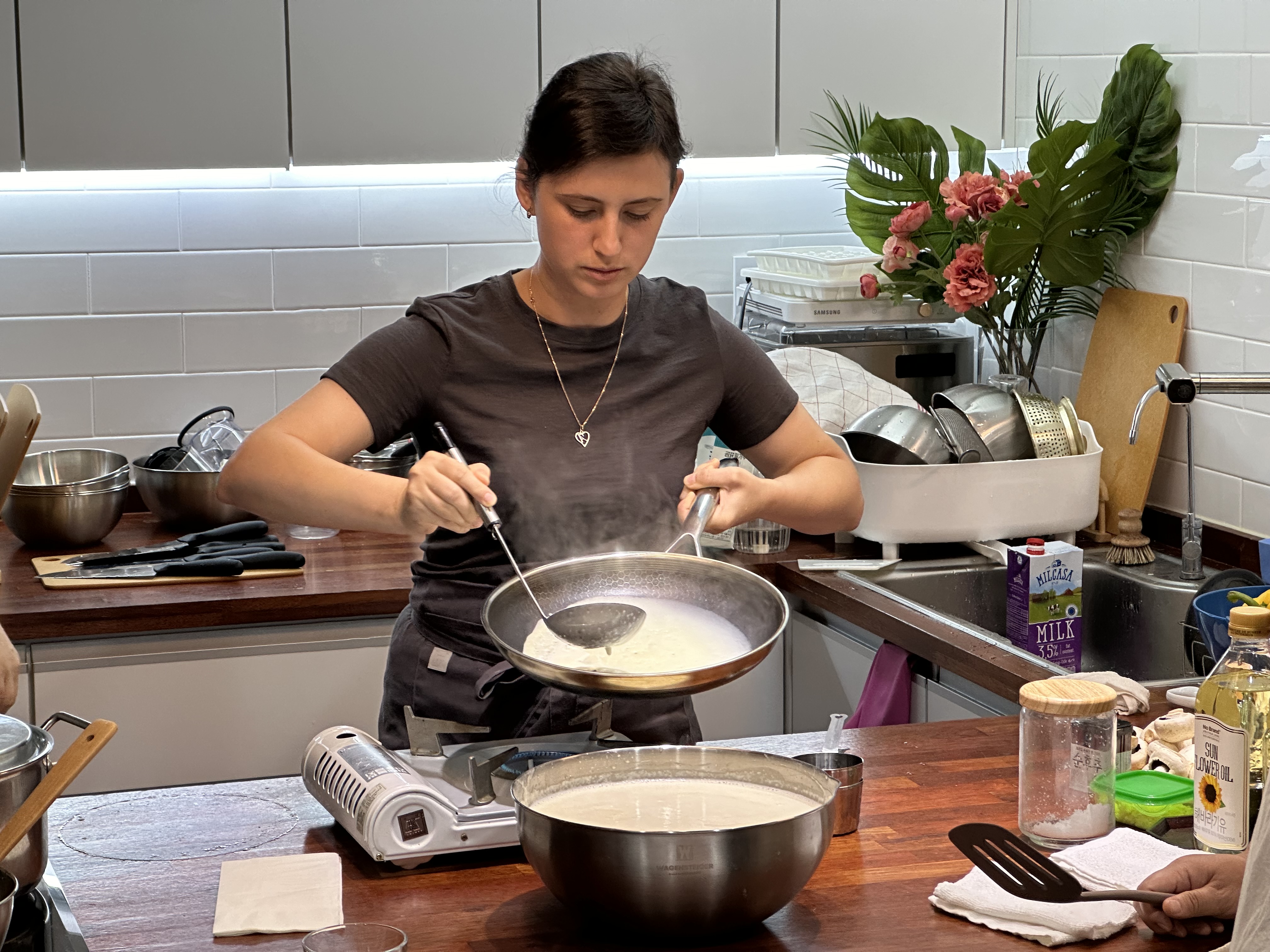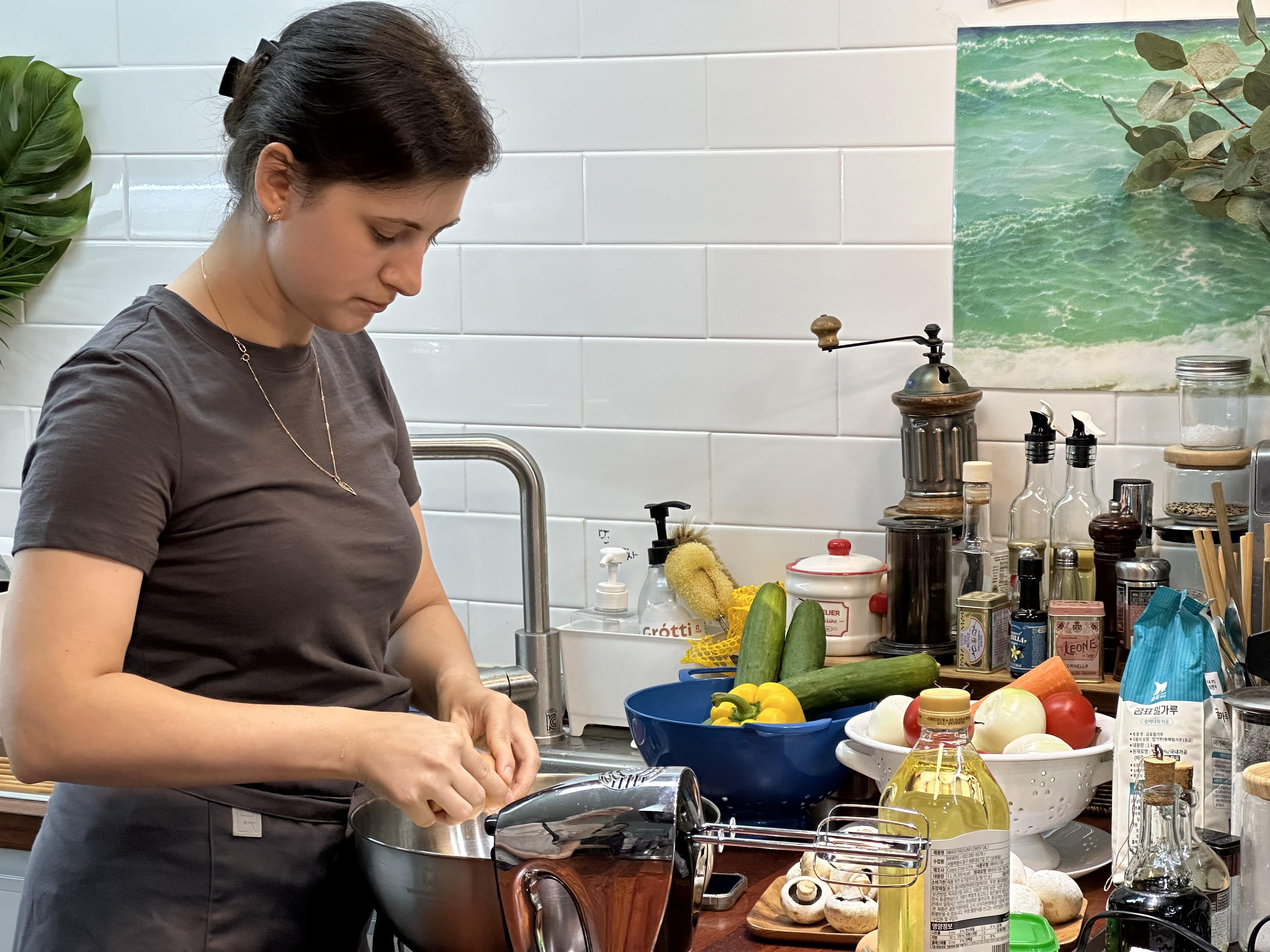 우선, 시작은 소고기 샐러드에 들어간 소고기를 다듬 것 부터 시작했습니다. 소고기에 소금과 후추만으로 간을 한 후 물기 없게 조려 식혔습니다.  그 사이 블리니 반죽을 만들어 봤습니다. 들어가는 것도 많지만 순서를 잘 지켜해야 맛있는 블리니를 만든다고 시간이 걸려도 차근차근 했습니다. 블리니 반죽은 얇게 부치는 것이 관건이었는데요...쉽지 않았나 봅니다. 몸에 힘이 잔뜩 들어서 뻣뻣했는데...서로 모습을 보면 잠시 웃고 갑니다.
