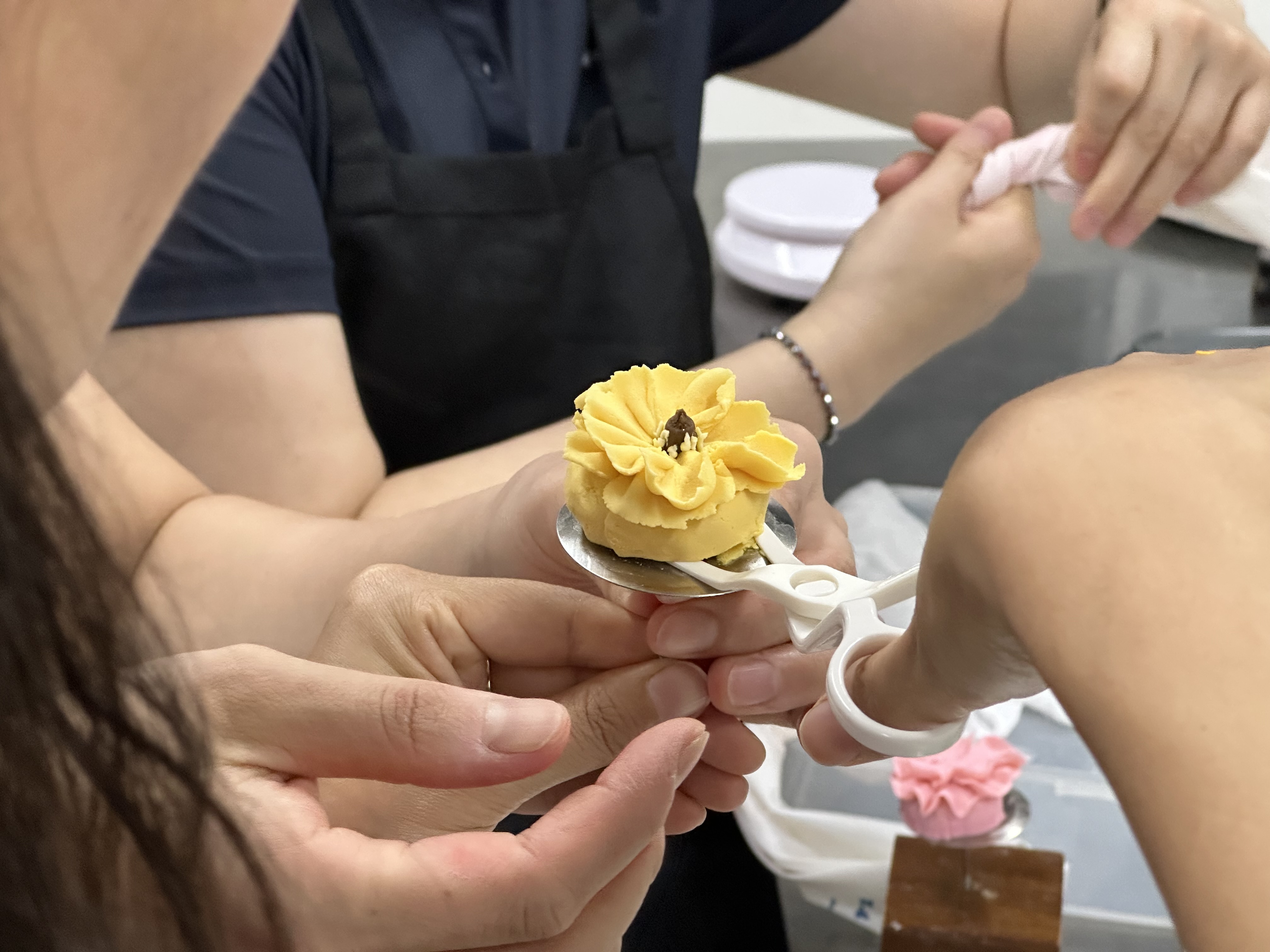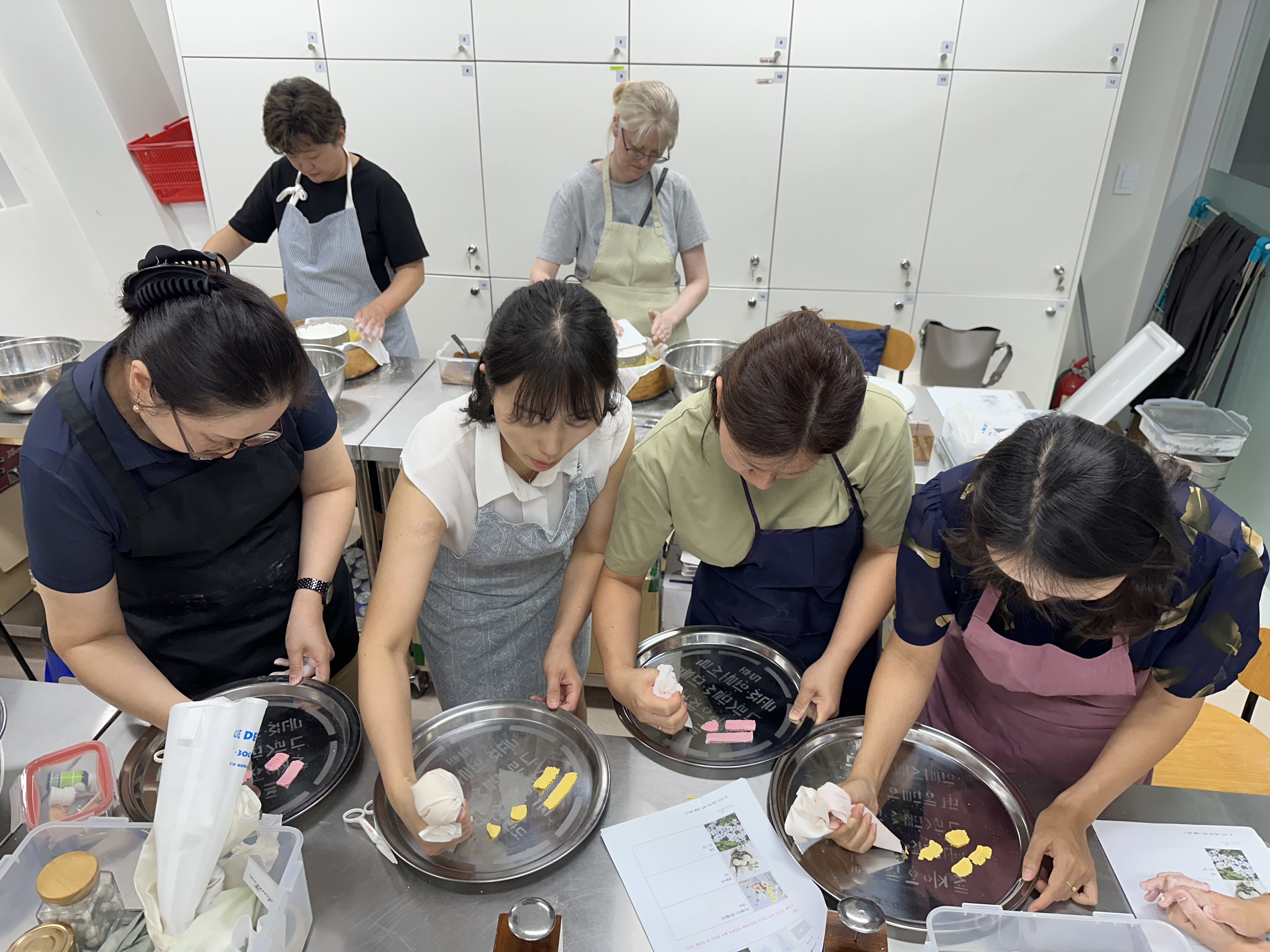 떡이 쪄지는 동안 강사와 함께 앙꼬에 이쁜 색깔을 넣어 짤주머니에 넣고 꽃모양 연습을 했습니다. 다들 한번 쯤 해 보셨는지 너무 잘한다고 했습니다. 꽃을 빈 틀에 올려서 빙글빙글 돌려가며 만들었습니다. 총 3가지 꽃을 만들어 봤는데...근사합니다~~