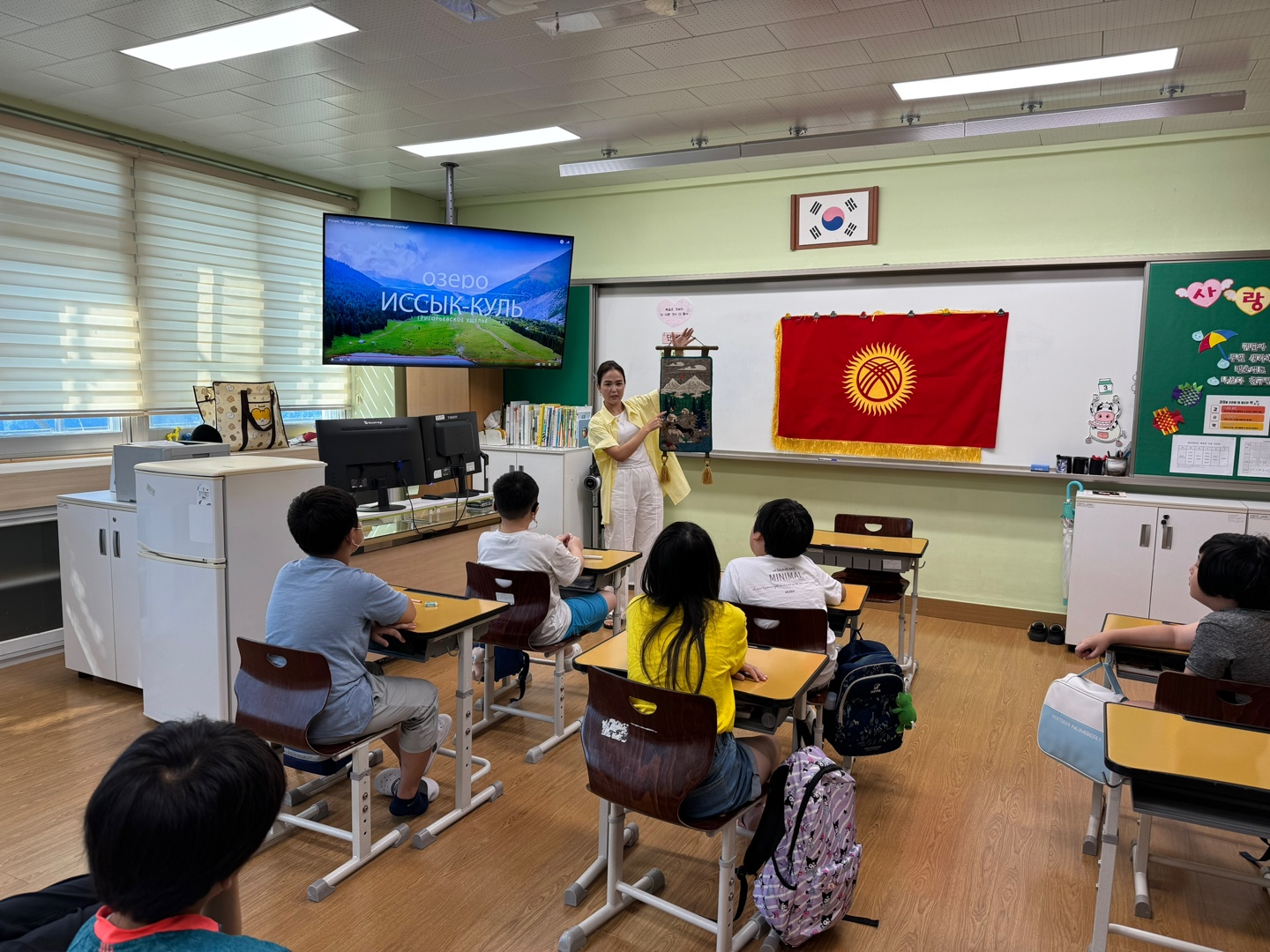 두번째 수업을 하였던 키르키스스탄 선생님은 자국의 국기와 머플러, 어른 남여의 모자와 말을 탈 때 쓰는 채찍 등을 준비하여 아이들이 착용해 보기도 하였습니다.