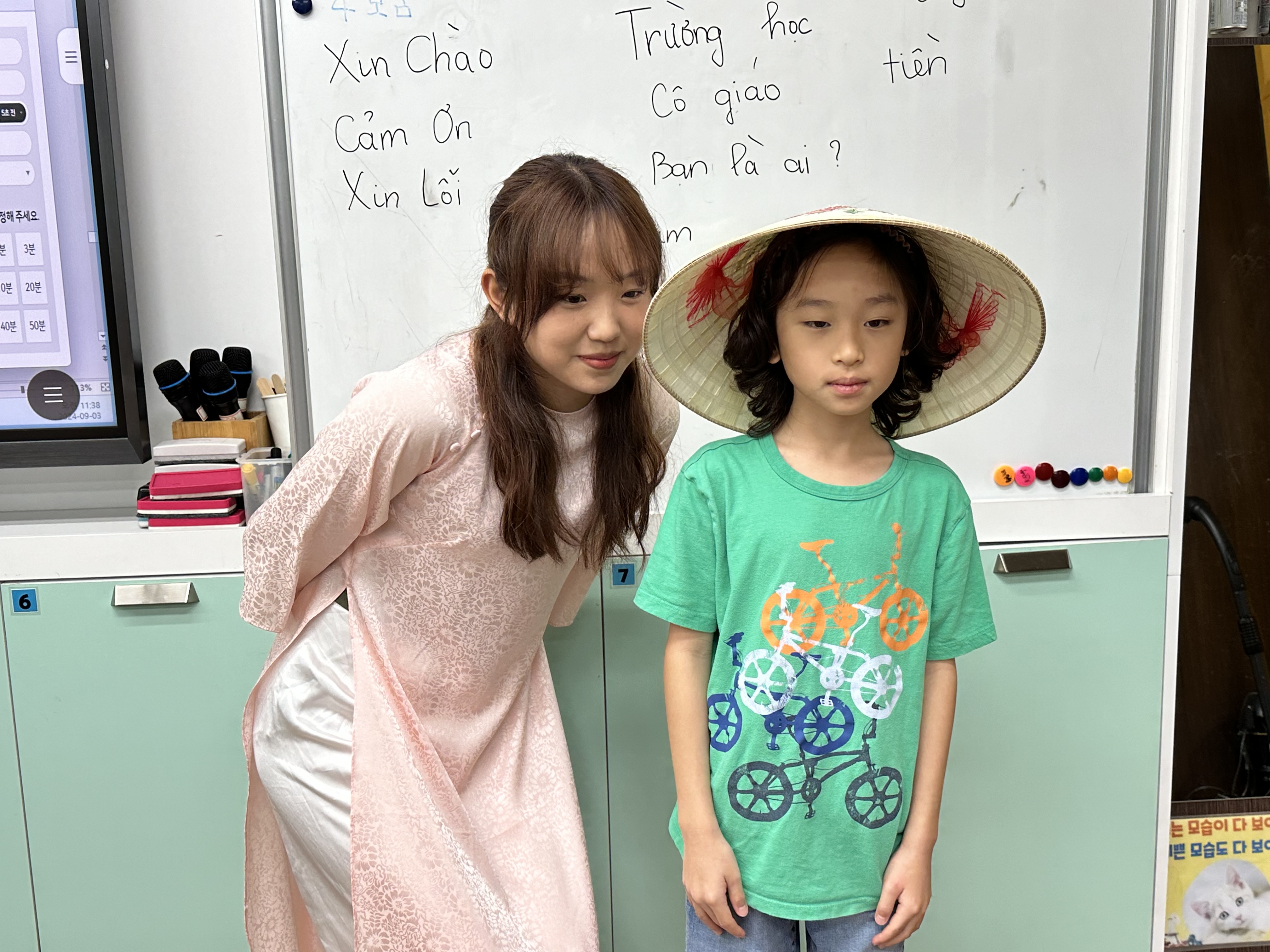 첫번째로 수업을 시작한 베트남 선생님은 '아오자이'를 입고 농라를 쓰고 성산초등학교 3,4학년들과 만났습니다.