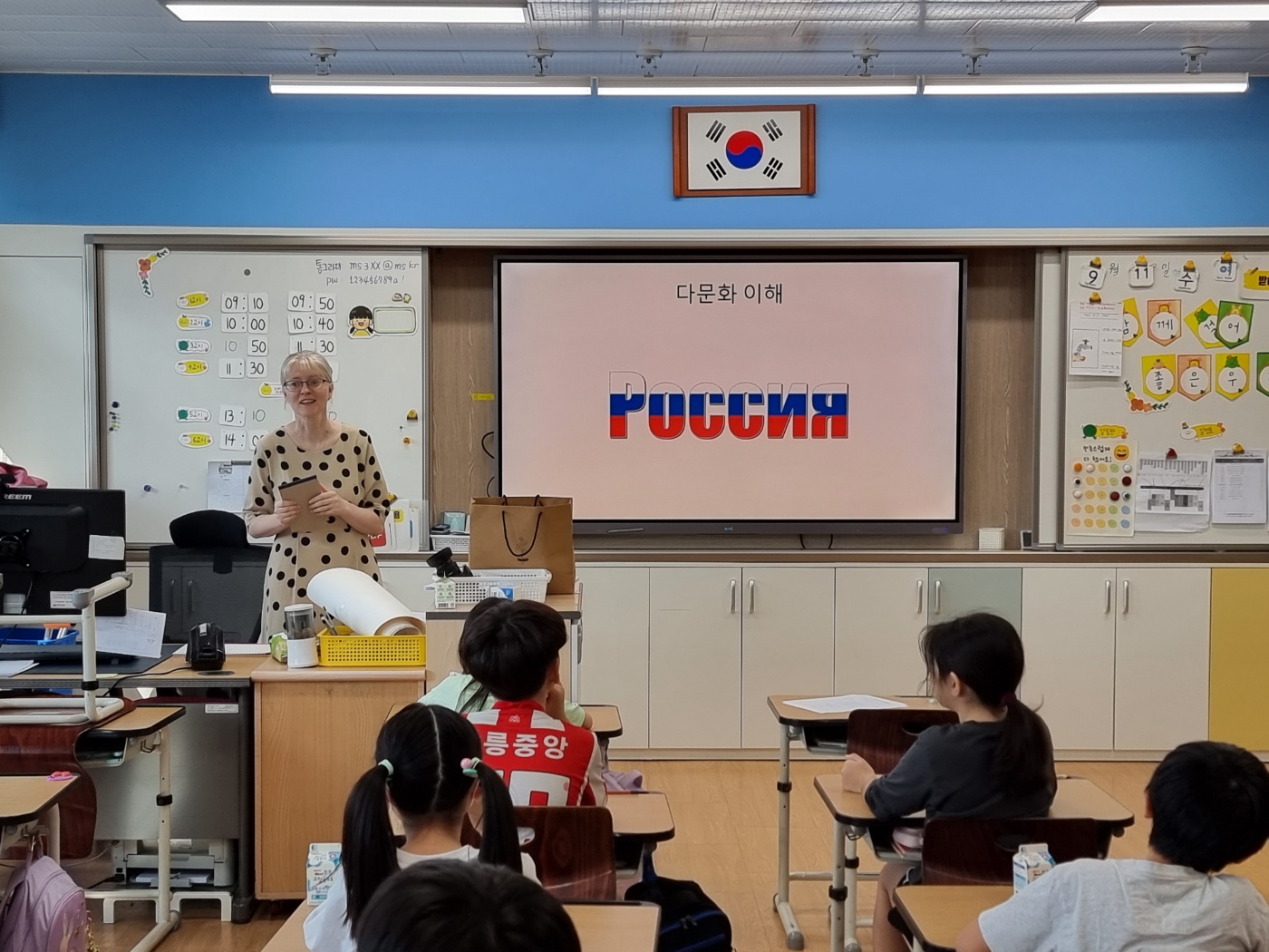 러시아 국기, 모이주기 장난감, 러시아 화폐를 준비하여 아이들의 호응과 양방향 수업이