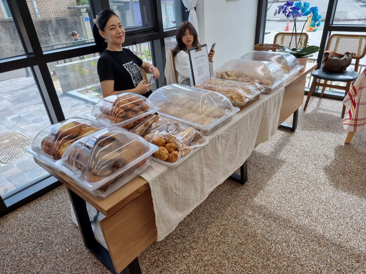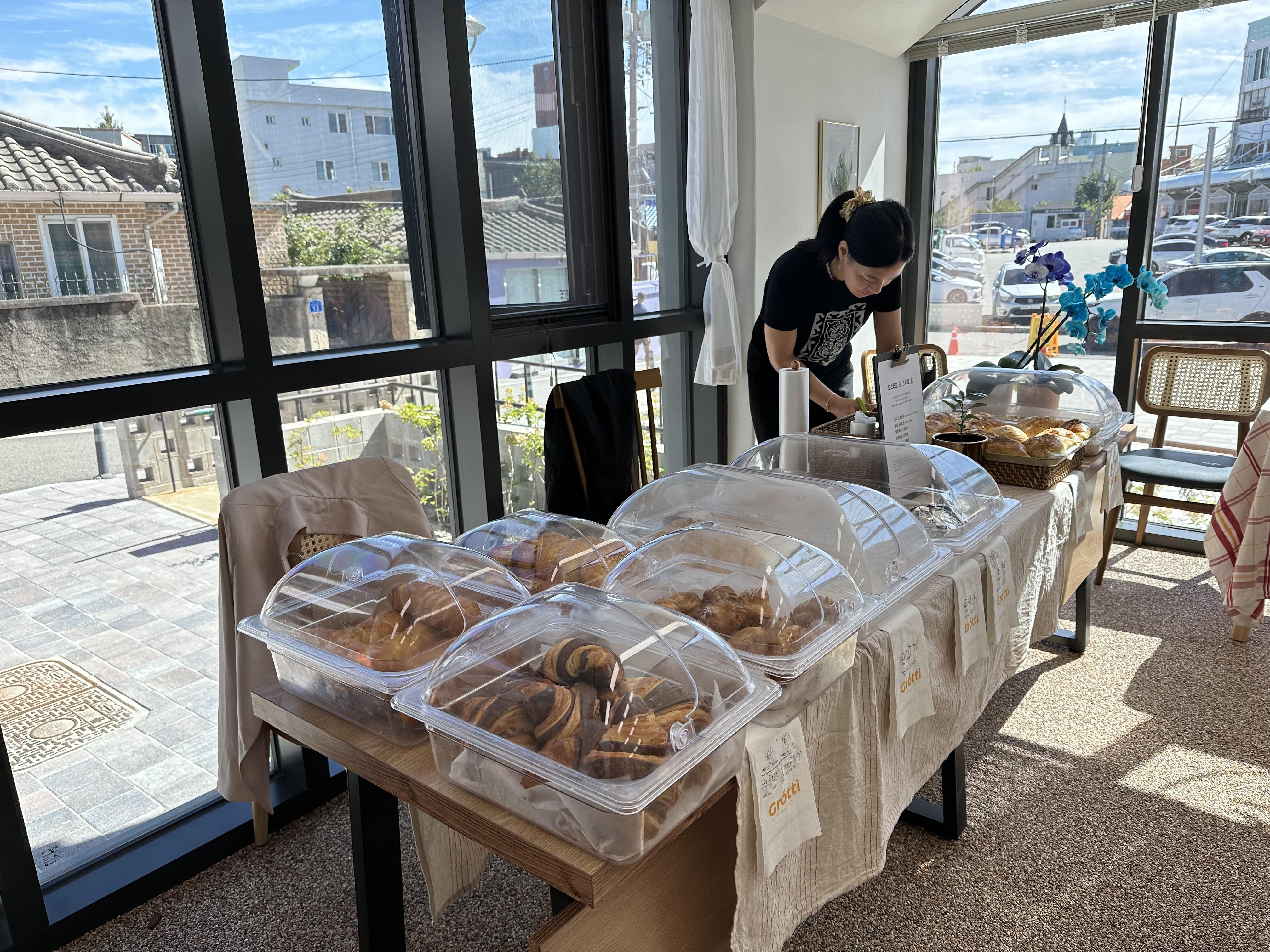 그로티 대표가 좋은 자리를 배정해 주었습니다. 햇살도 적당히 들고 뒤에 창문이 있어서 음식을 시원하게 전시할 수 있었습니다. 매대 위에 빵을 전시하고 손님이 오길 기다렸습니다. 고기 특유의 끌리는 냄새 때문인지 방문객이 자연스럽게 매대 앞에 서서 무슨 빵인지를 물어봤습니다.