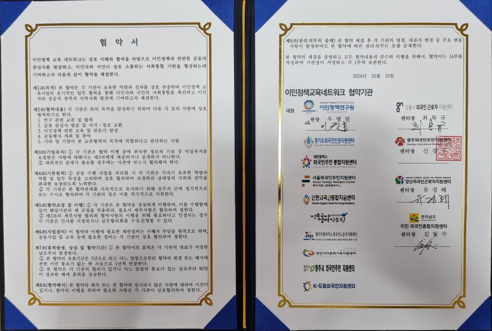 이민정책연구원과 함께하는 이민정책교육네트워크에 참여하여 협약을 맺었습니다.
