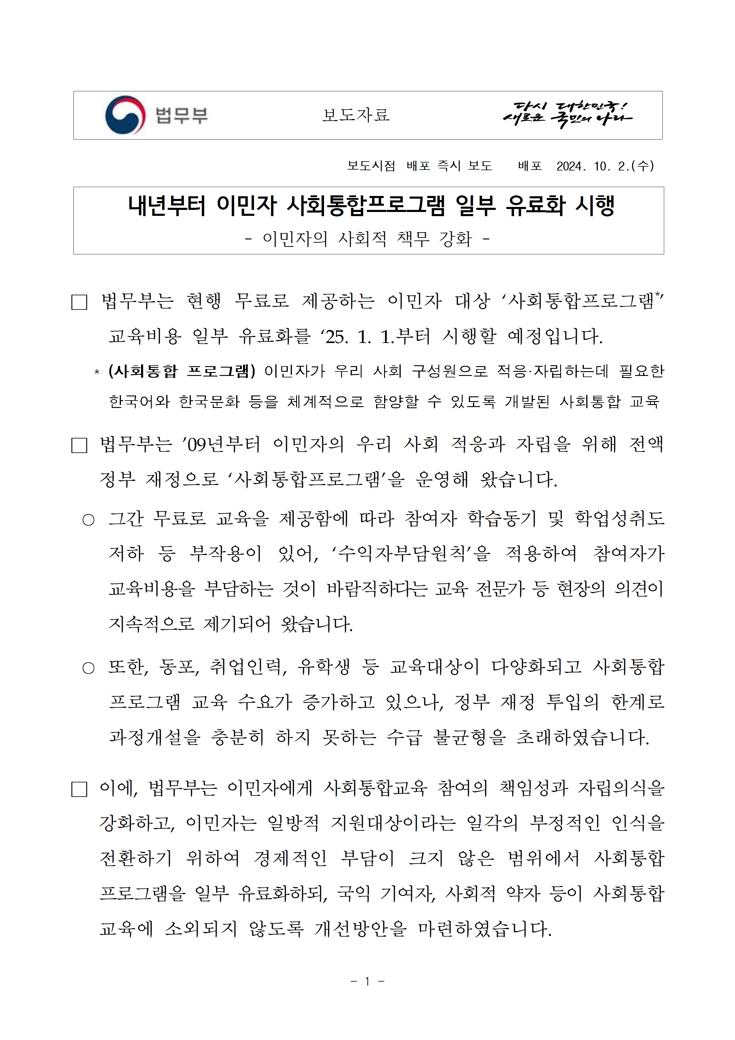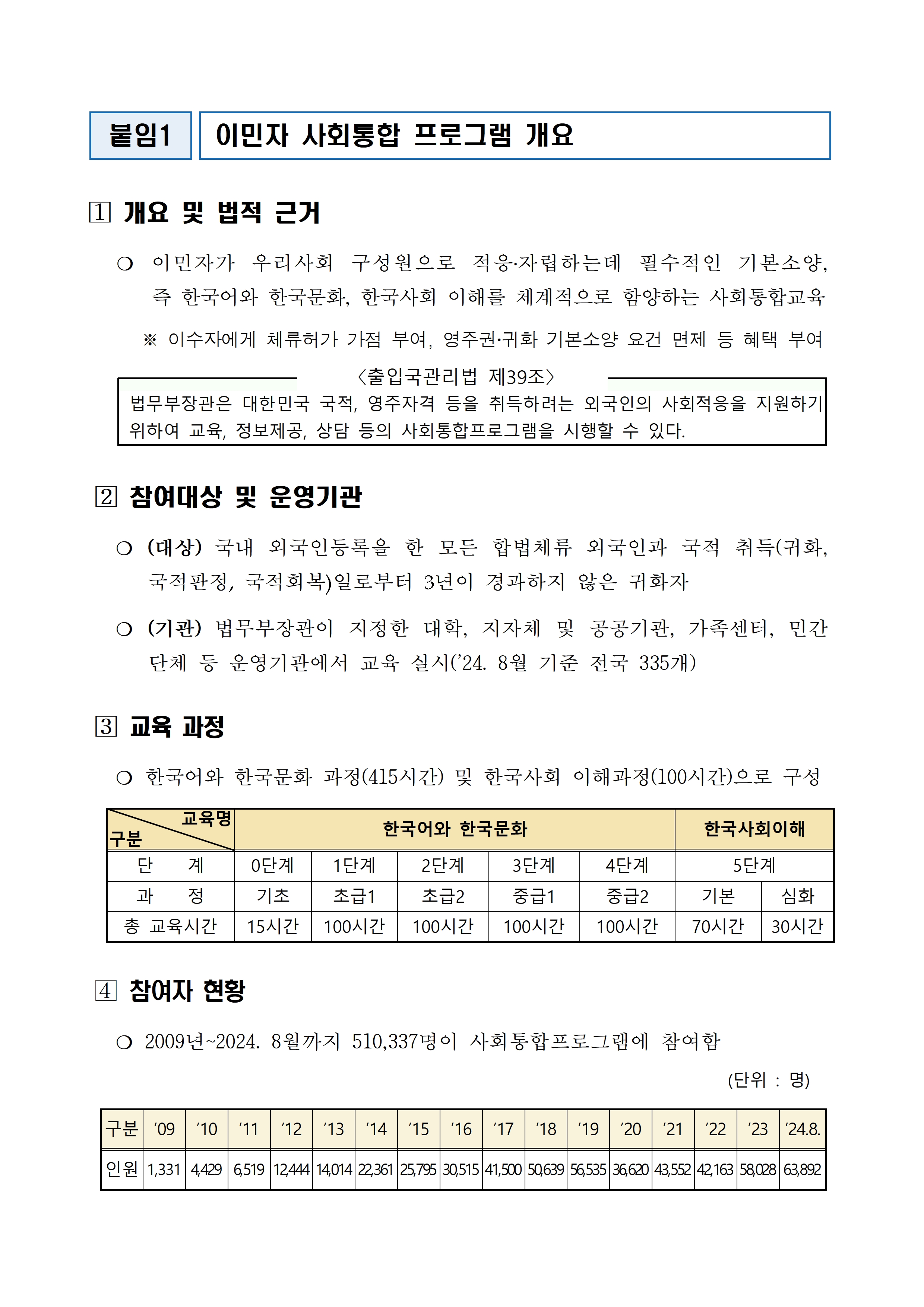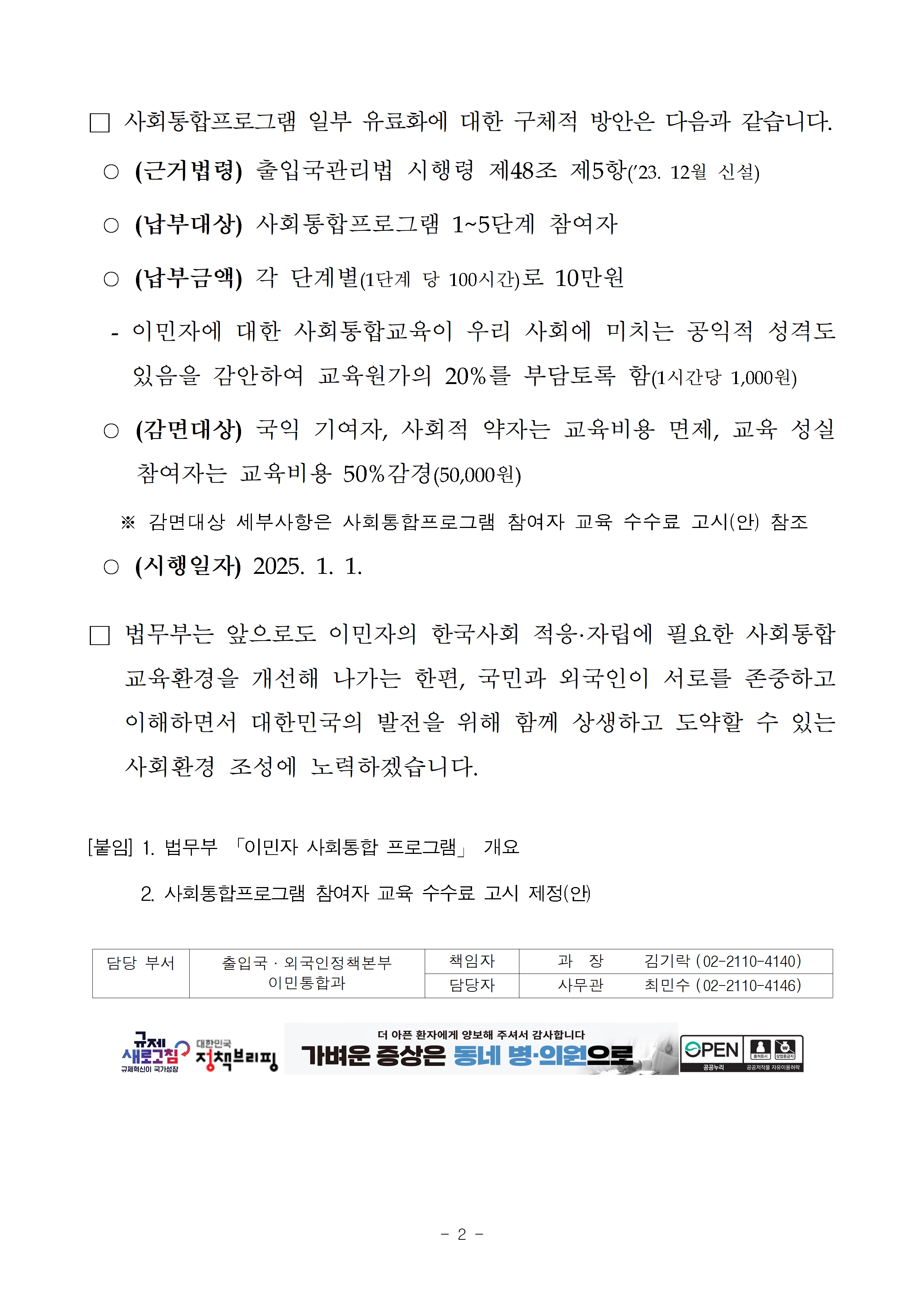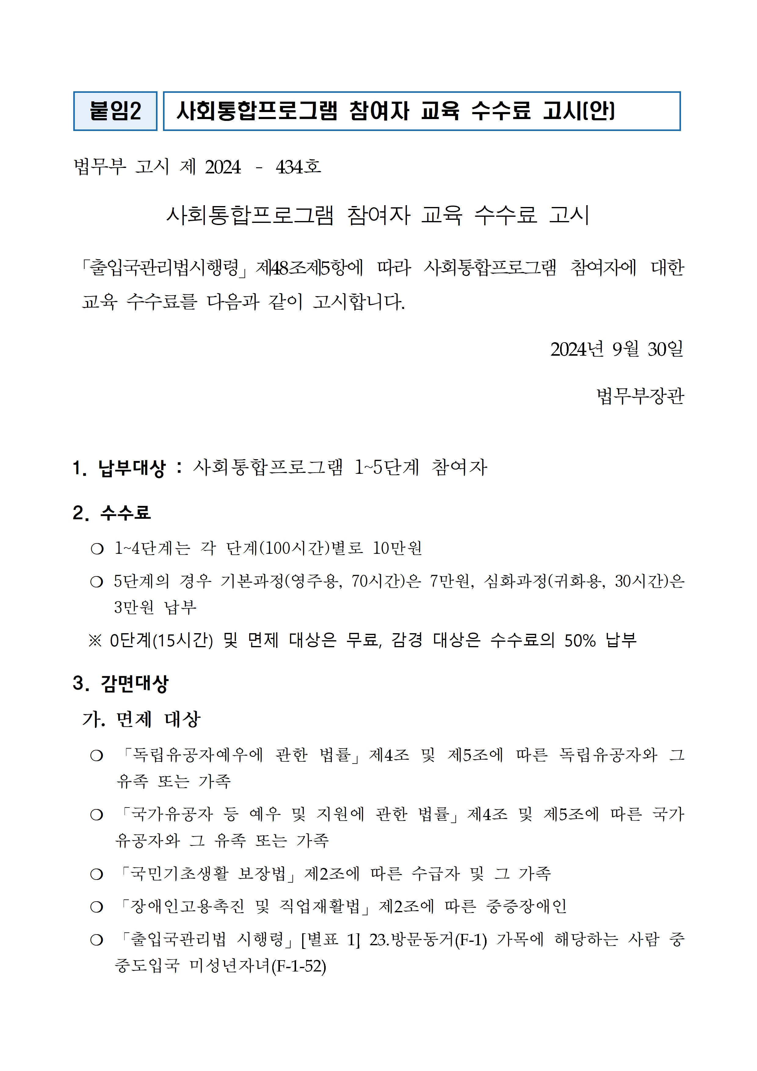 사회통합프로그램읠 일부 프로그램이 2025년 부터 유료로 전환됩니다.