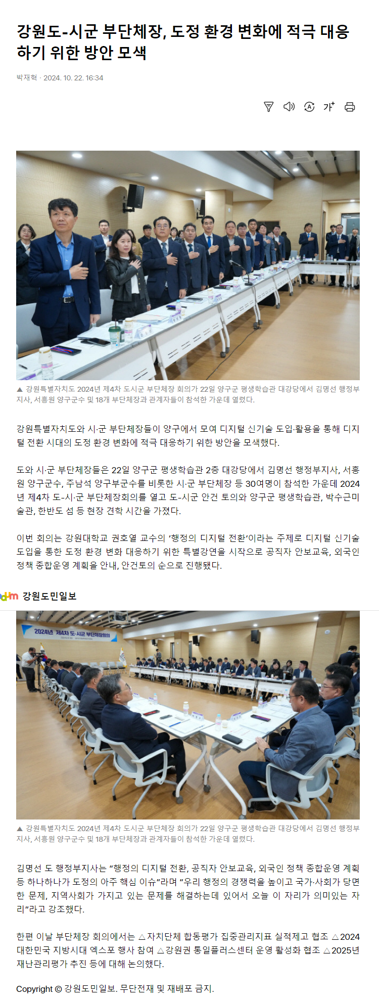 강원특별자치도와 시·군 부단체장들이 양구에서 모여 디지털 신기술 도입·활용을 통해 디지털 전환 시대의 도정 환경 변화에 적극 대응하기 위한 방안을 모색했다. 도와 시·군 부단체장들은 2