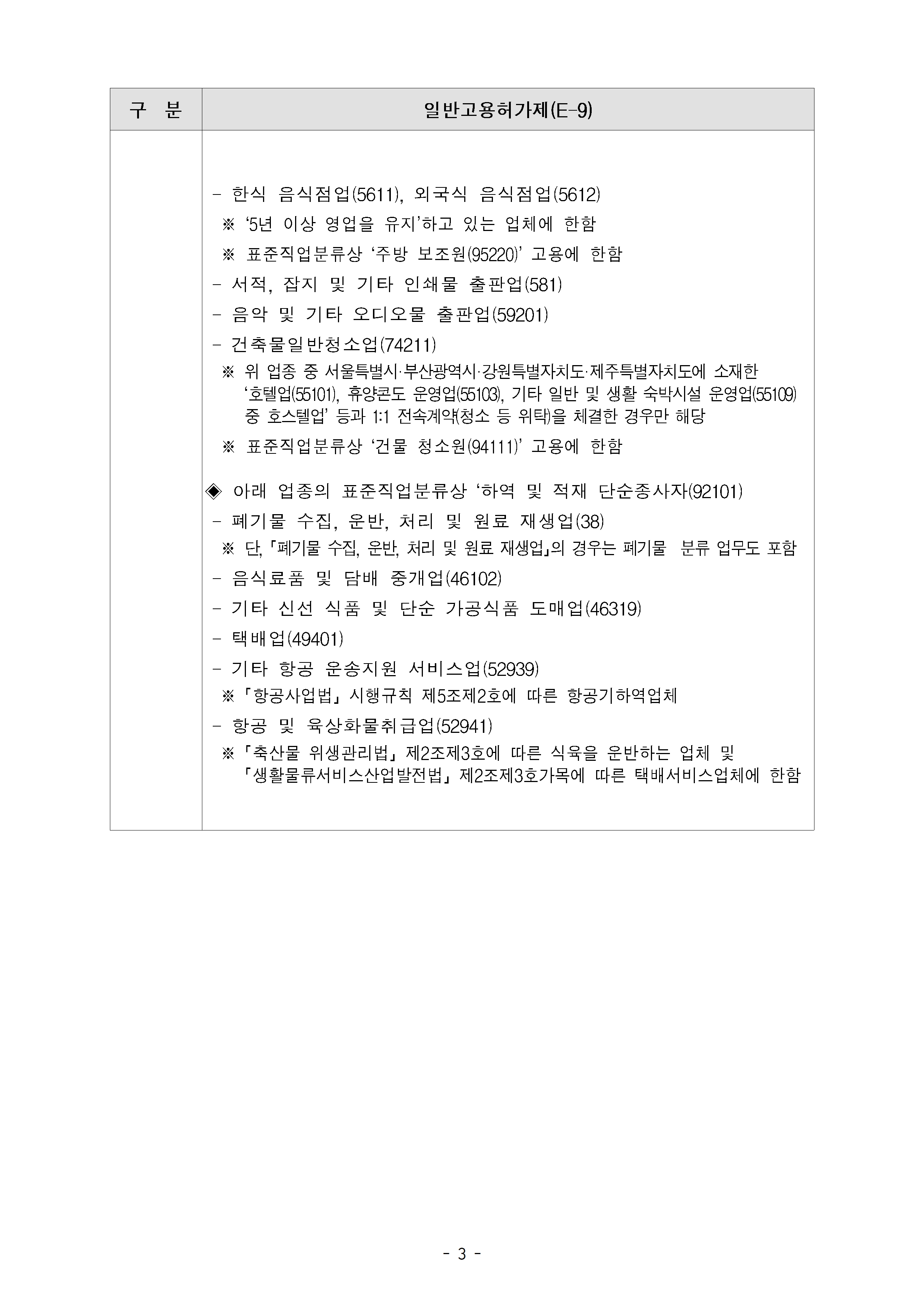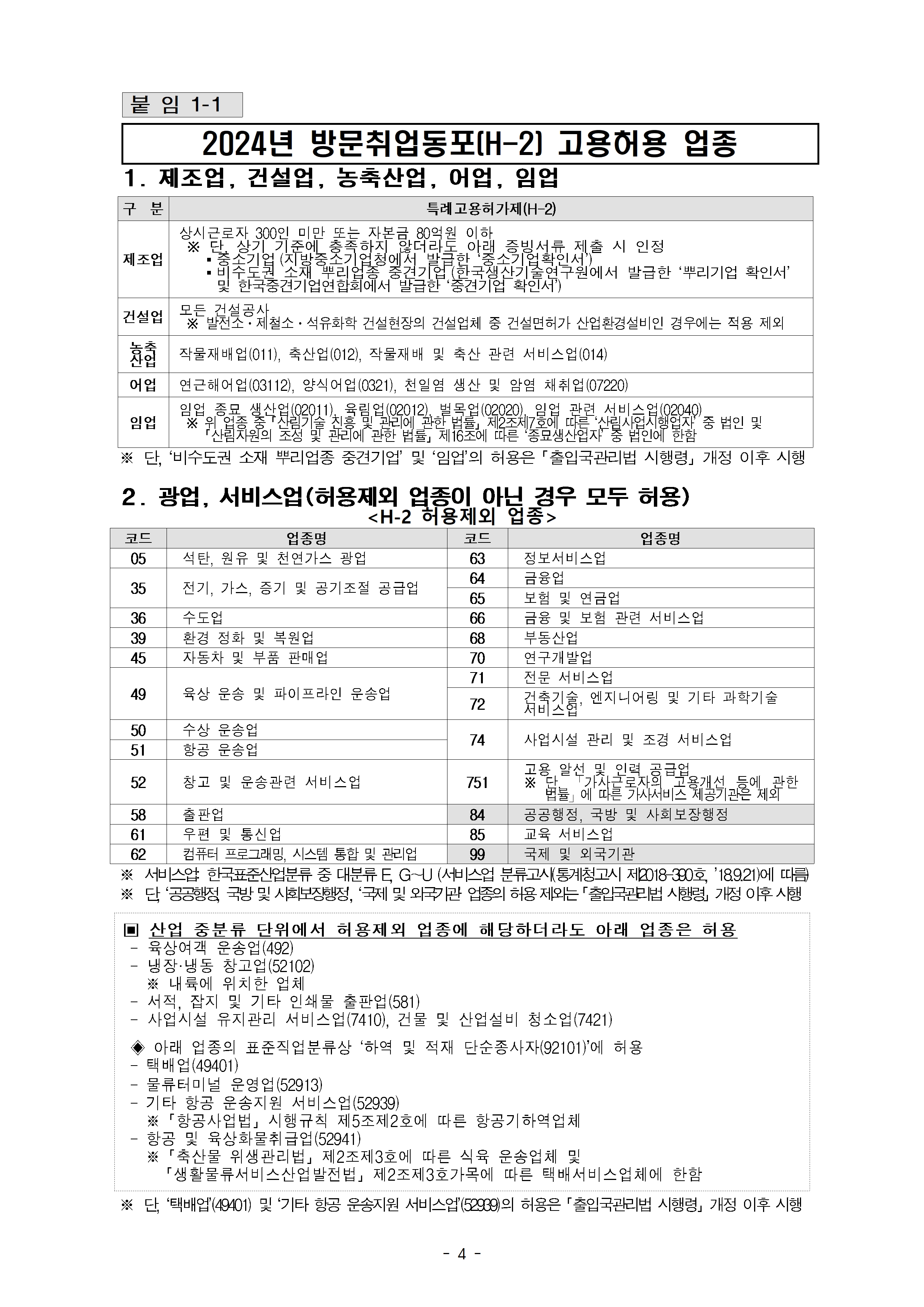 2024년 10월 외국인력정책위원회 결정사항 중 일반 외국인근로자(E-9)과 방문취업동포(H-2)의 고용 허용업종을 안내드립니다.