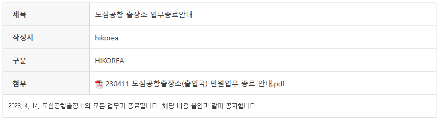 도심공항출장소 종료 안내입니다.