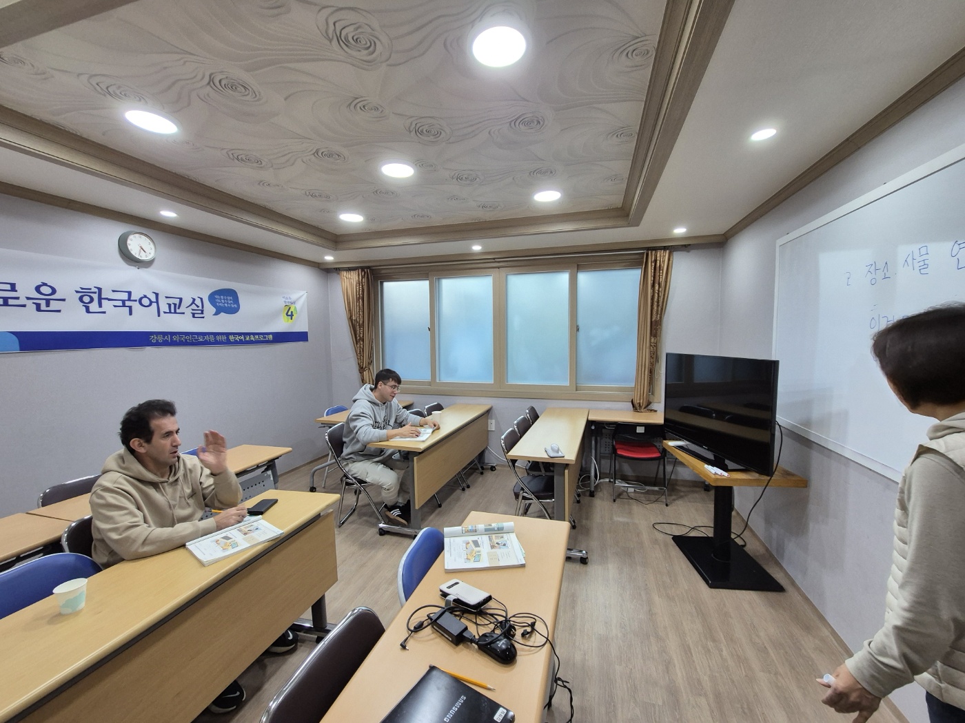 새로운 외국인근로자가 늘어서 일요일오전반은 초급에서 중급 사이로 난이도를 조정하였습니다. 교재도 어느 덧 2권이 끝날 때가 되다보니 교재 수준도 제법 올라갔습니다. 수업 중 어려운 부분은 강사가 잠시 시간을 내서 별도로 알려주기도 합니다. 곧 종강입니다. 시즌 5에는 어떤 외국인근로자와 공부를 하게 될지 기대가 됩니다.