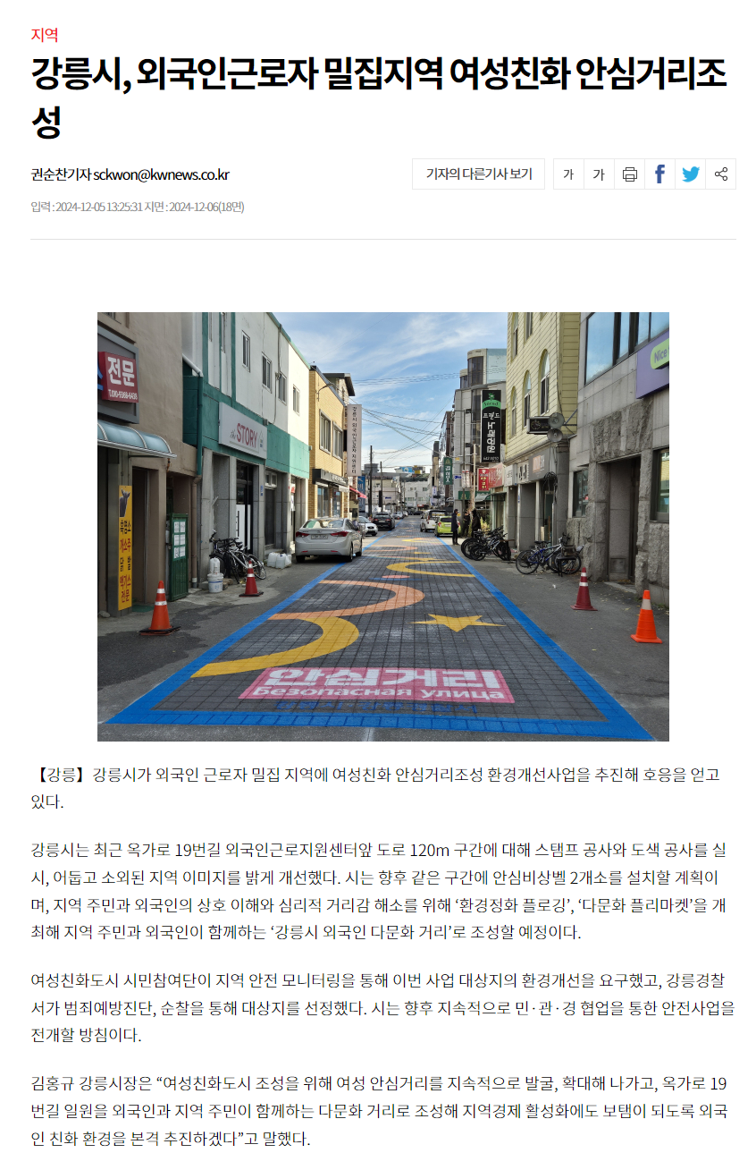 | [경향신문] 강릉시, 외국인 근로자 밀집지역에 '여성친화 안심거리 조성' (0) | 2024.12.08 |