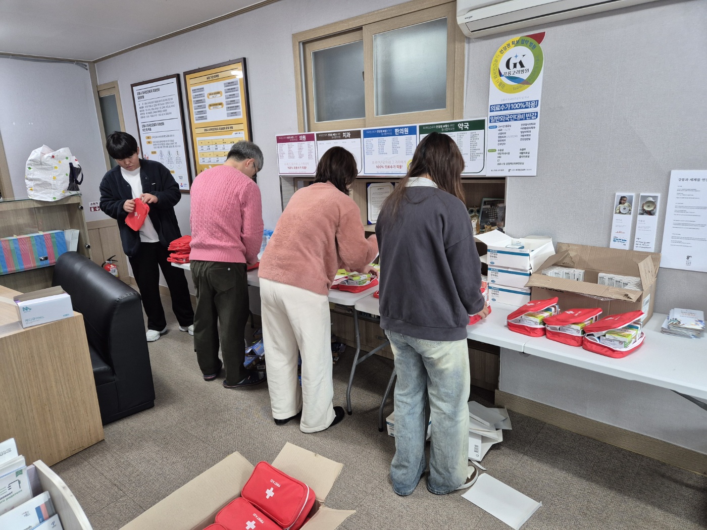 이리저리 맞춰보고 가장 적합한 방법을 찾아서, 센터 직원과 자원봉사자와 함께 구급낭에 담았습니다. 다들 손이 날래서 생각보다 빨린 마무리 할 수 있었습니다.