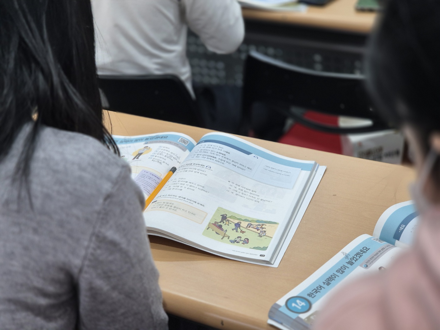 한국어자원봉사자가 수업을 진행하고 있습니다. 강사의 말로는 외국어 습득은 엄청 빠르지만, 이중언어를 사용하지 않고 있기 때문에 러시아어 자원봉사자가 필수라고 합니다. 지금은 한국어를 잘하는 외국인근로자가 도와주고 있습니다. 센터 현황에 맞는 교재를 개발하고자 많은 노력과 연구를 했지만, 결국에는 기존 사회통합 0단계와 성인문해교실 교재를 사용하고 있습니다. 내년에는 정말 우리 실정에 맞는 교재를 만들겠죠?