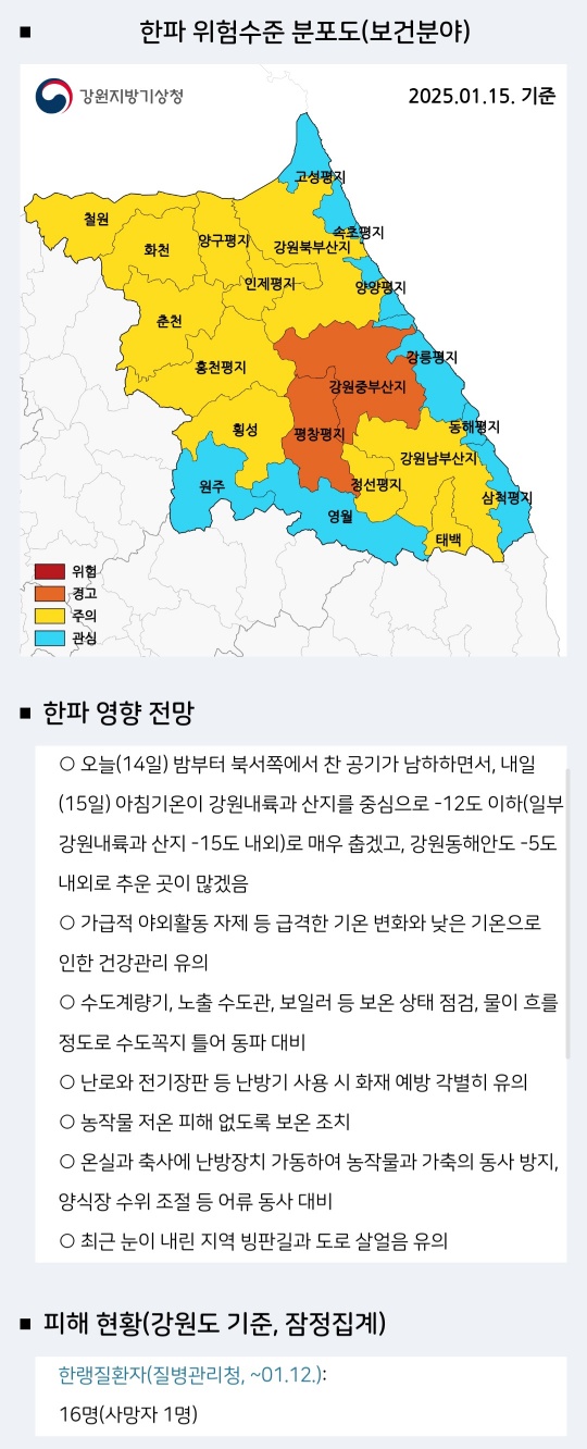 강릉시에 한파 영향예보 관심 단계가 발표되어 한랭질환 발생 가능성이 있으니 야외활동 시 모자,장갑,목도리 등을 착용하여 보온에 유의하시기 바랍니다.