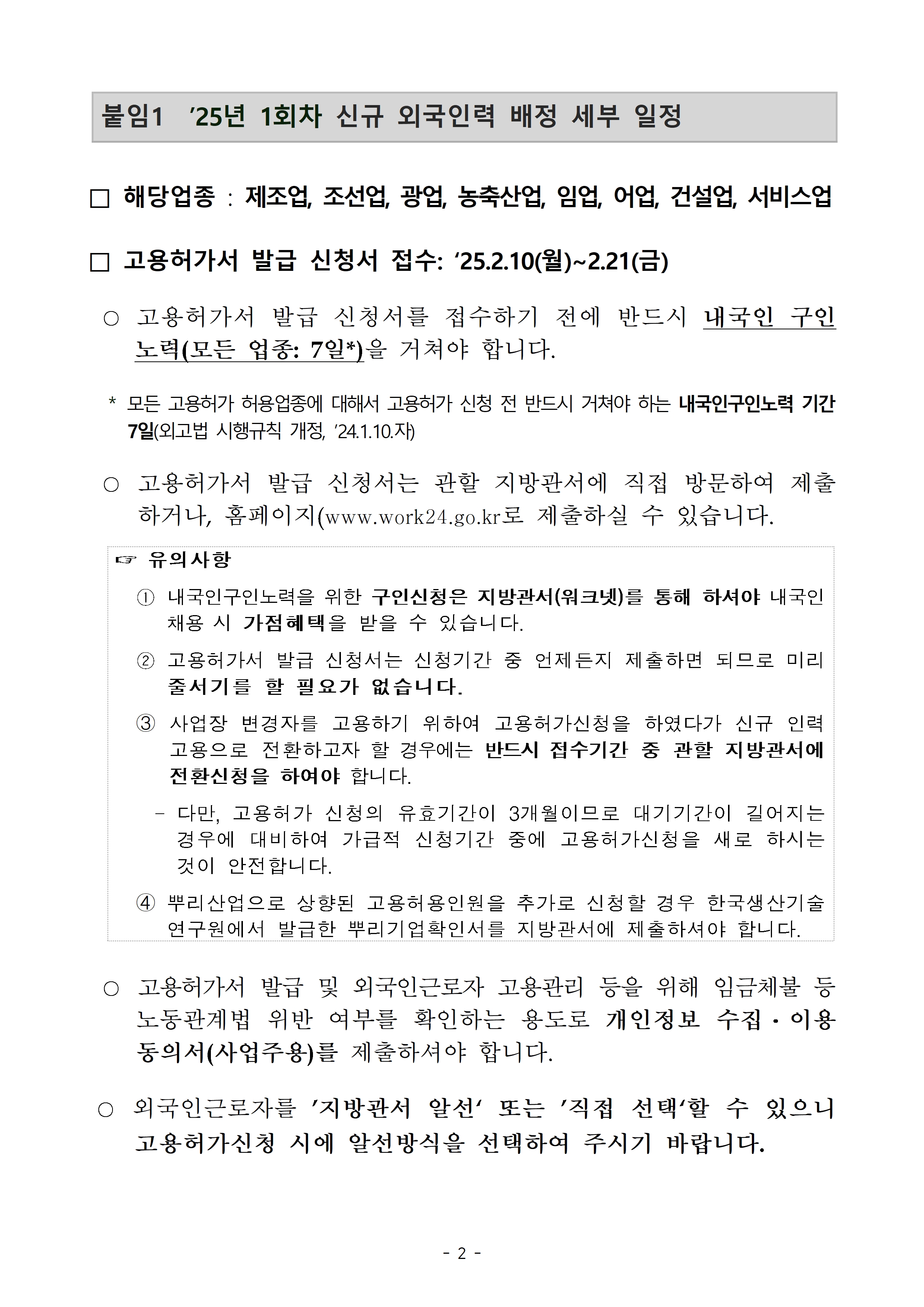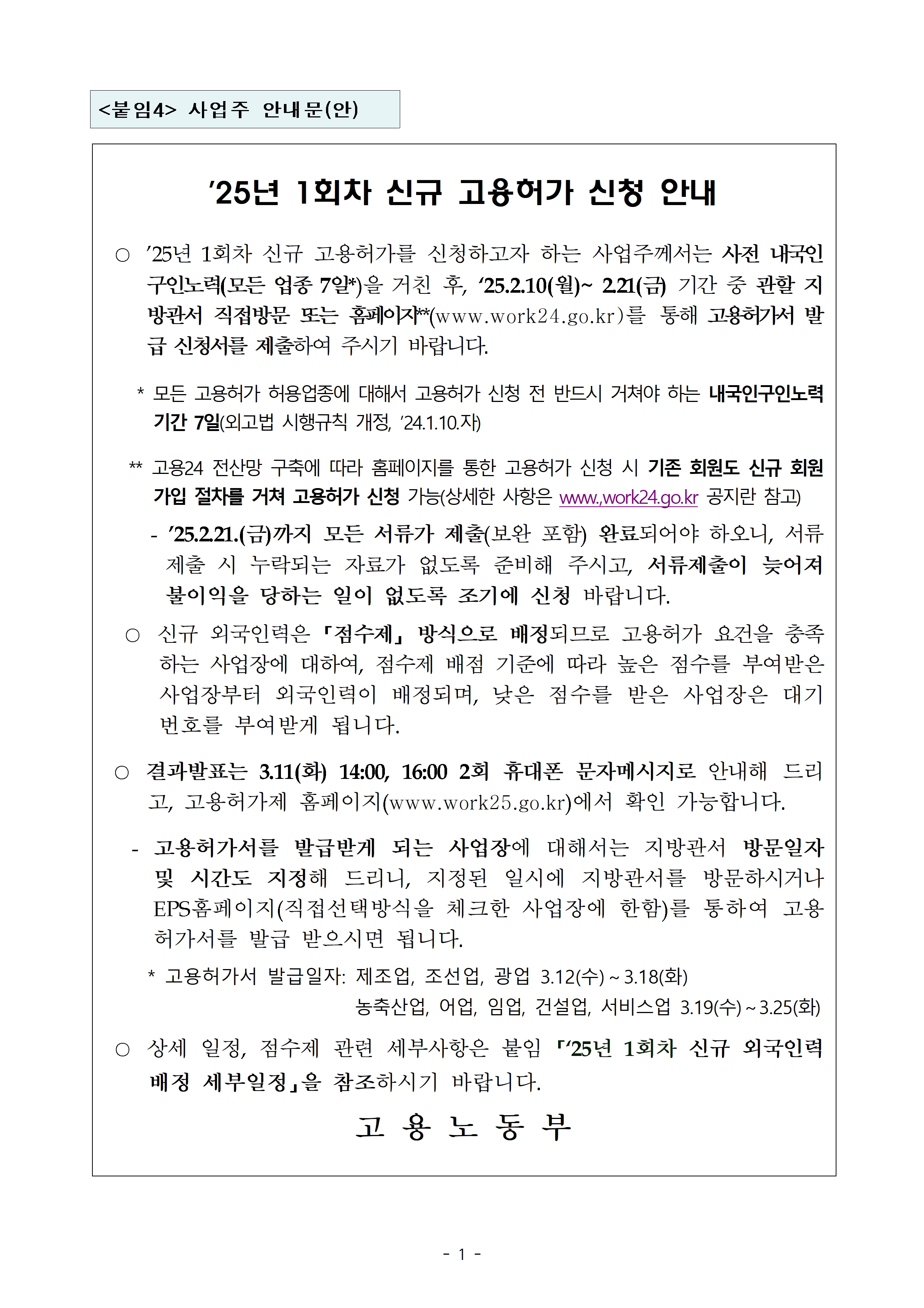 카테고리 없음 [고용노동부] 2025년 1회차 신규 외국인력 배정계획 안내 by 강릉시 외국인근로자 지원센터 2025. 2. 2. 고용노동부에서 발표한 2025년 1회차 신규 외국인력 배정안내 계획입니다. 2025년+1회차+신규+외국인력+배정계획(사업주+안내용).hwp 0.08MB 공유하기 게시글 관리 강릉시 외국인근로자 지원센터 저작자표시 (새창열림)