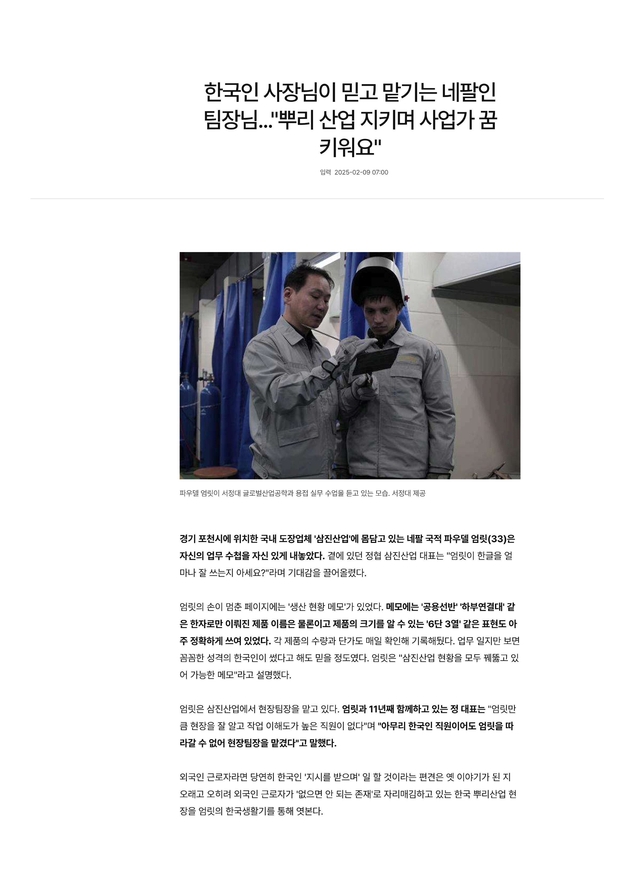 원문기사 : 한국일보_한국인 사장님이 믿고 맡기는 네팔인 팀장님...뿌리 산업 지키며 사업가 꿈 키워요