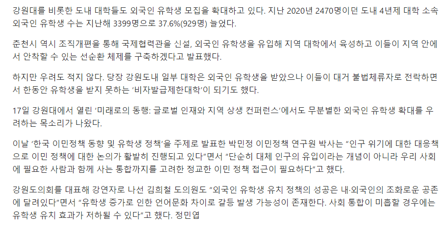 [강원도민일보] 강원 외국인 유학생 유치 사활...무분별 확대 우려 목소리