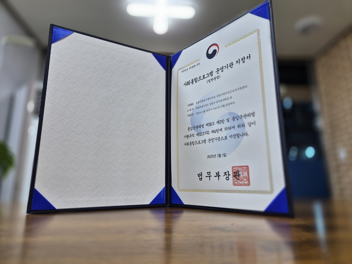 오늘은 지정서가 도착해 센터 잘 보이는 곳에 자랑삼아 걸어 놨습니다.