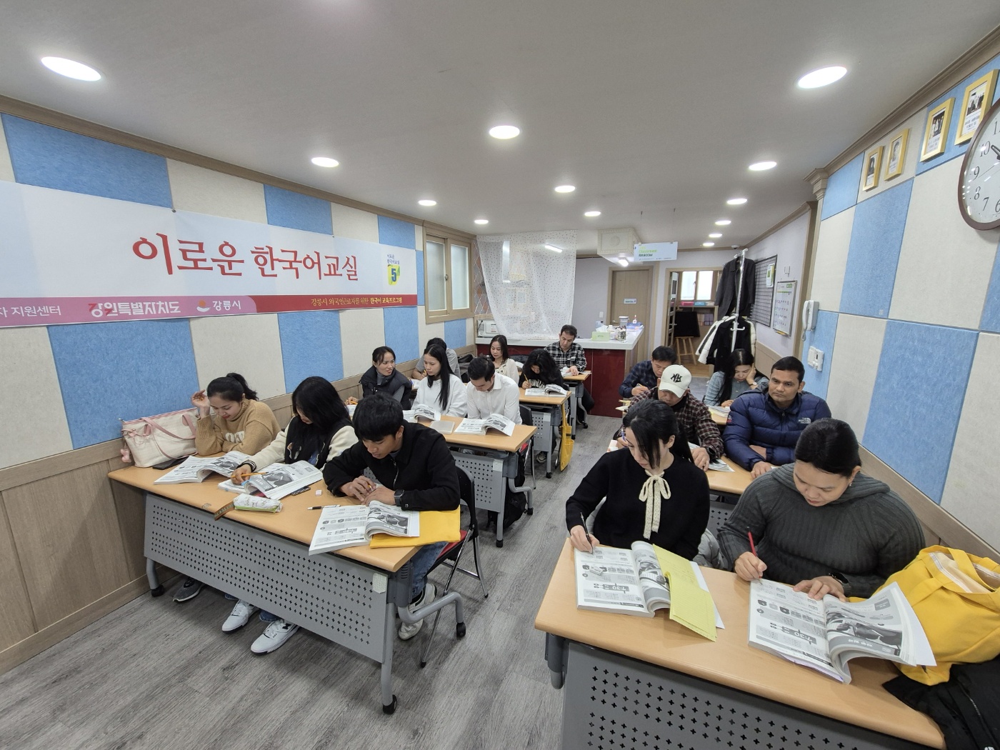 참여하는 외국인근로자 수가 많아지다 보니 강의실이 좁아 생기는 불편함도 있습니다. 넉넉하게 사용하던 책상도 교재와 노트 한권을 놓으면 꽉 찹니다.핸드폰도 꺼내놔야 모르는 단어를 찾아가면서 공부를 할 수 있는데, 주머니에서 넣다 뺐다 하니 이것도 불편합니다. 그 전에 간식으로 나오던 초코파이도 3개씩 먹었는데...이젠 조금만 늦게 가면 먹을 게 없습니다.