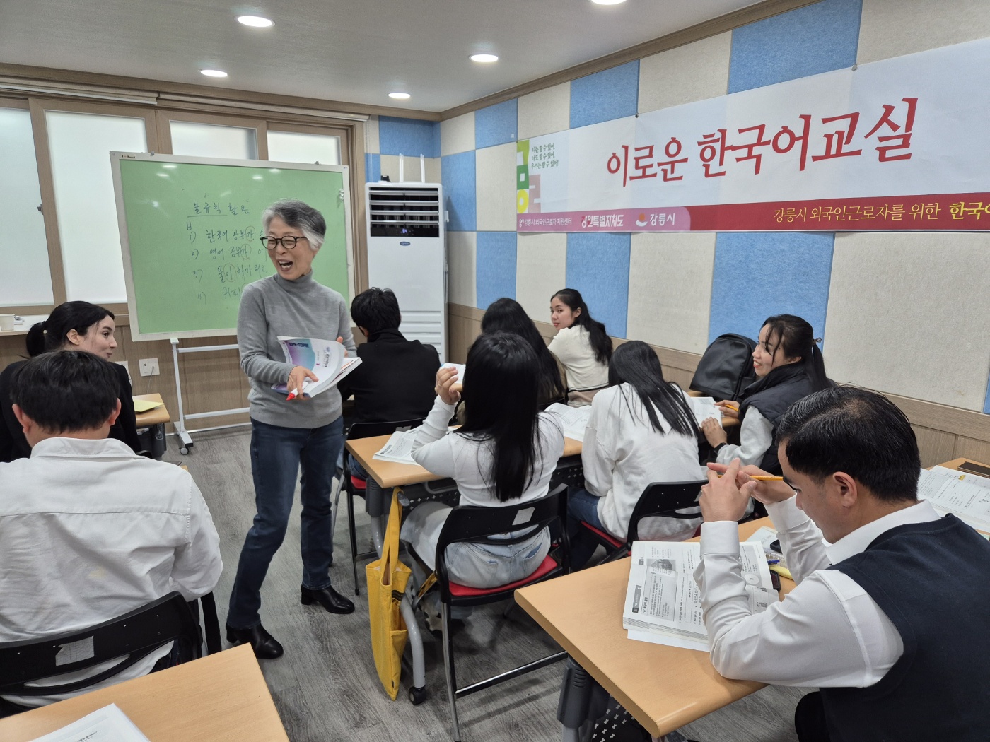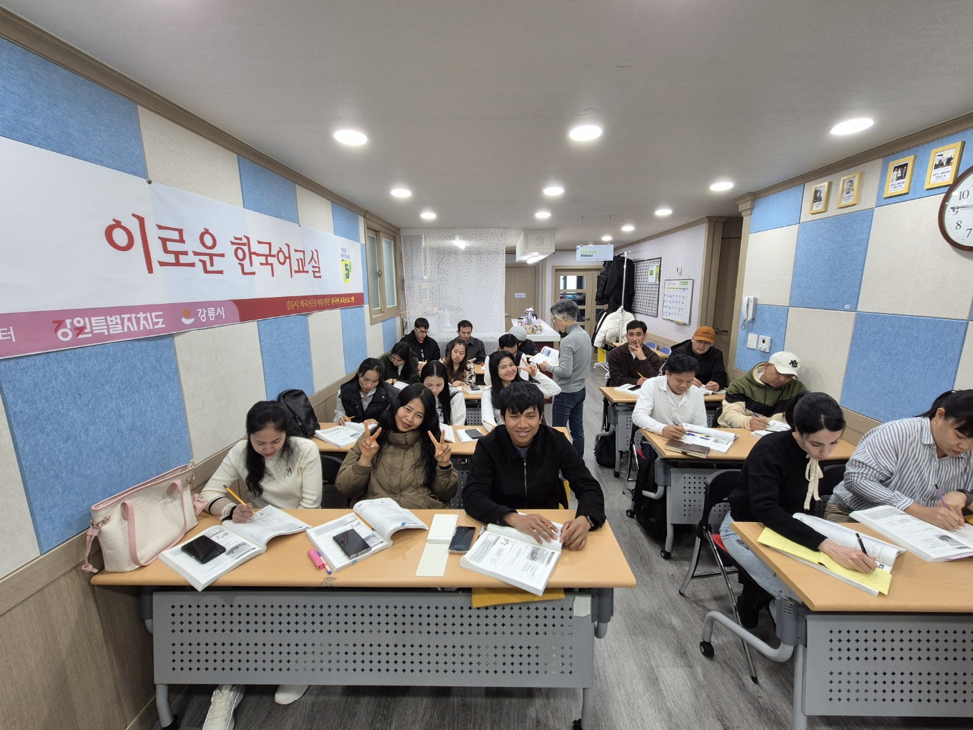 이로운 한국어교실 시즌5, 일요일오전반을 운영하였습니다. 얼마전까지만 해도 동남아의 고용허가제 국가에서 온 외국인근로자가 대부분 이었지만, 현재는 알제리, 러시아, 카자흐스탄, 러시아 등 국적도 다양해 졌습니다. 공용어로 한국어를 사용하기 때문에 공부 시간만큼 쉬는 시간도 떠들썩 합니다. 간간이 무슨 이야기를 하나 들어보면, 어디 음식점이 맛있다, 쿠팡에서 무엇을 샀는데 좋더라...뭐~이런 이야기를 나눕니다.